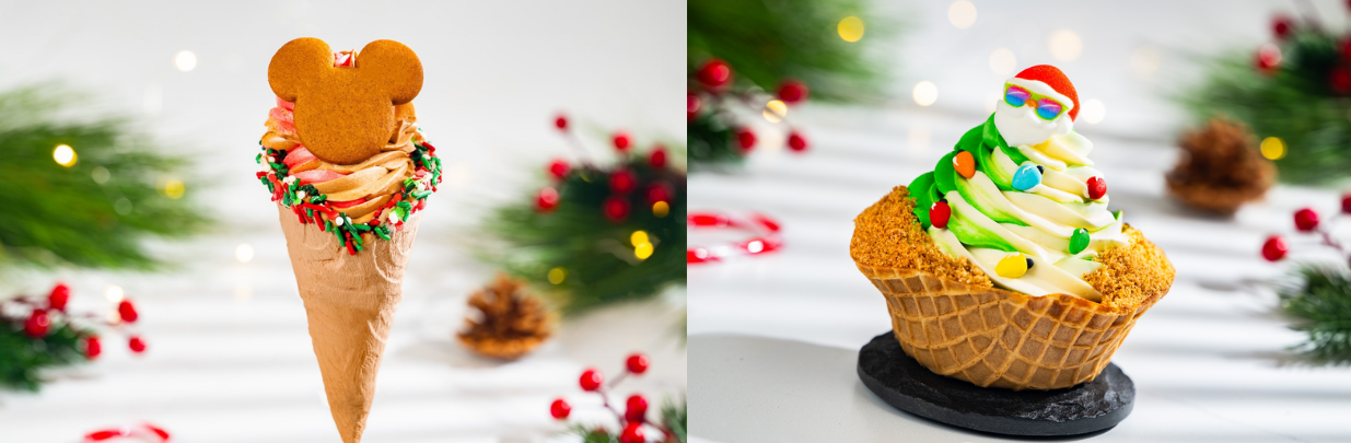 - Mickey Gingerbread Cone: Gingerbread cone with chocolate soft-serve, DOLE Whip pomegranate, holiday sprinkles, and gingerbread Mickey (New)