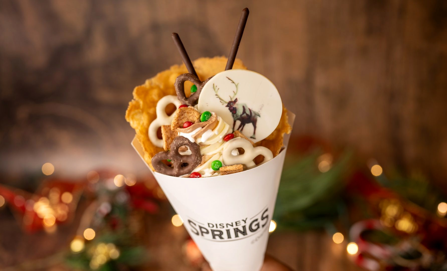 - Sven Reindeer Food Waffle Sundae: Vanilla and chocolate soft-serve swirl, white and dark chocolate-coated pretzels, M&M’S Mini’s Milk Chocolate Candies Holiday Blend, cinnamon cereal, marshmallow sauce, and a white chocolate coin