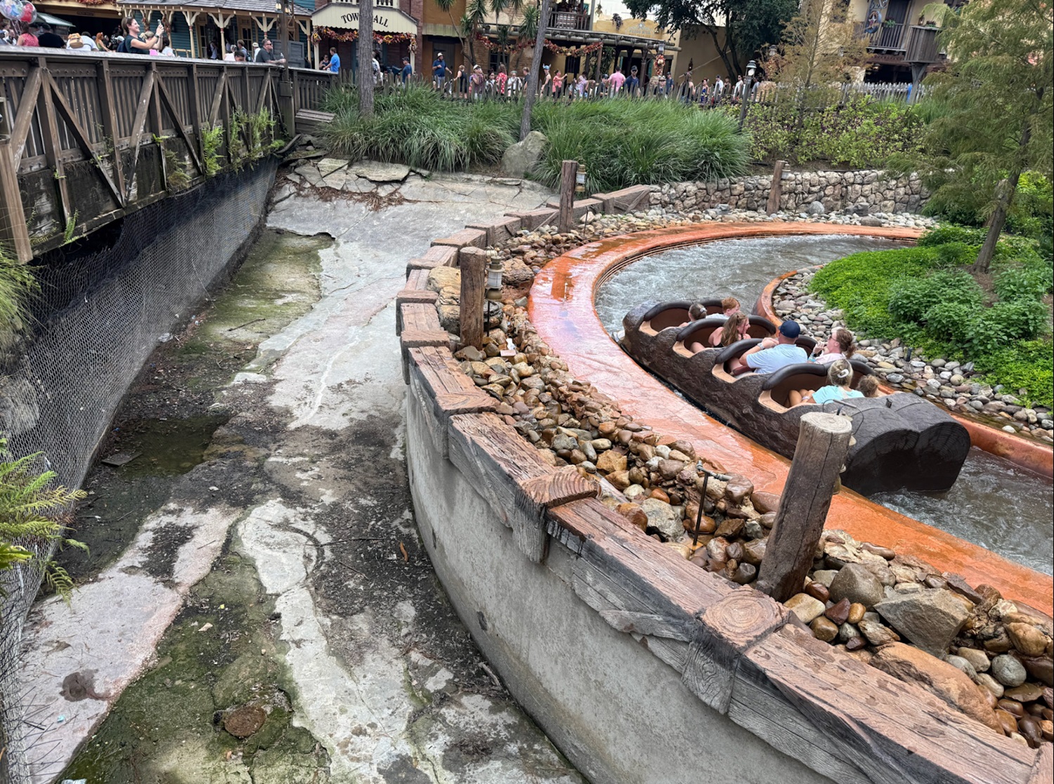 The area surrounding the runoff after the final drop on Tiana’s Bayou Adventure has also been drained.