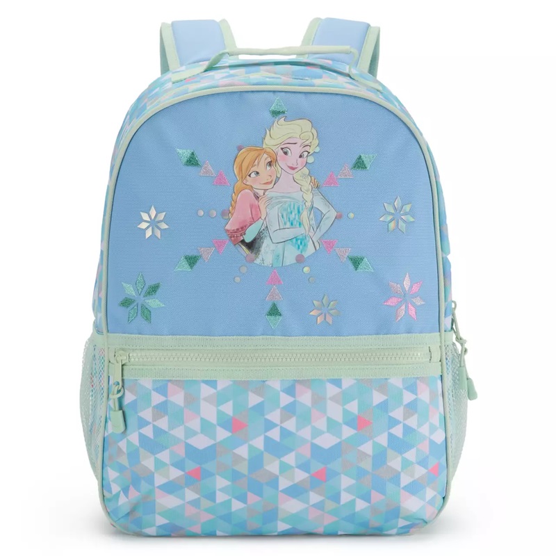 This Frozen backpack will cause a flurry of excitement when they head back to school. Arendelle's royal sisters, Anna and Elsa, are pictured at the center of a snowflake design featuring embroidered detailing and iridescent accents. The rest of this spacious carryall is covered in a colorful geometric pattern. For added convenience, pair it with the coordinating lunch box, sold separately.