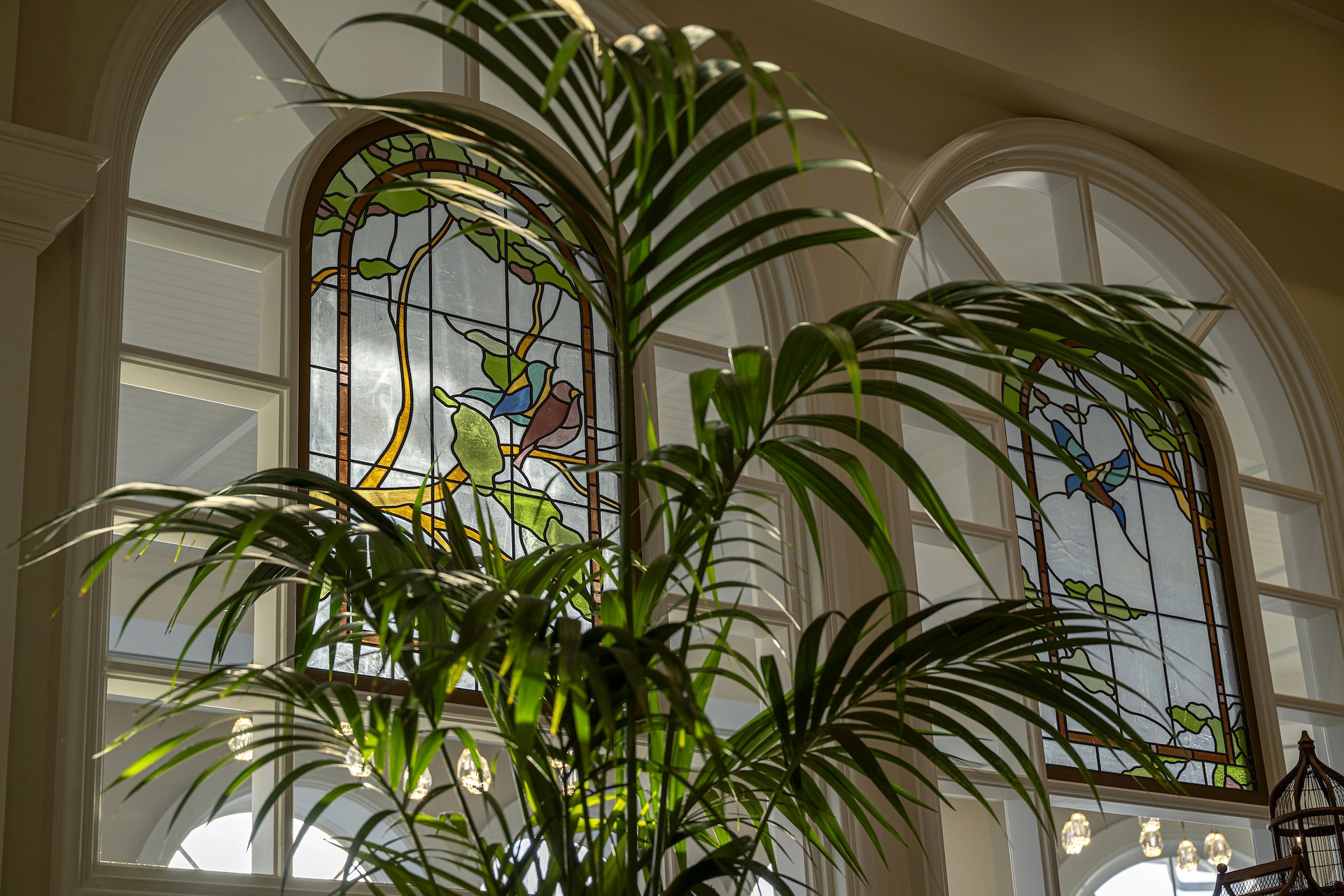 - The brass-framed mirrors resemble flower petals, reflecting an outdoor garden, while the stained-glass windows featuring native Floridian birds add color, character, and warmth.