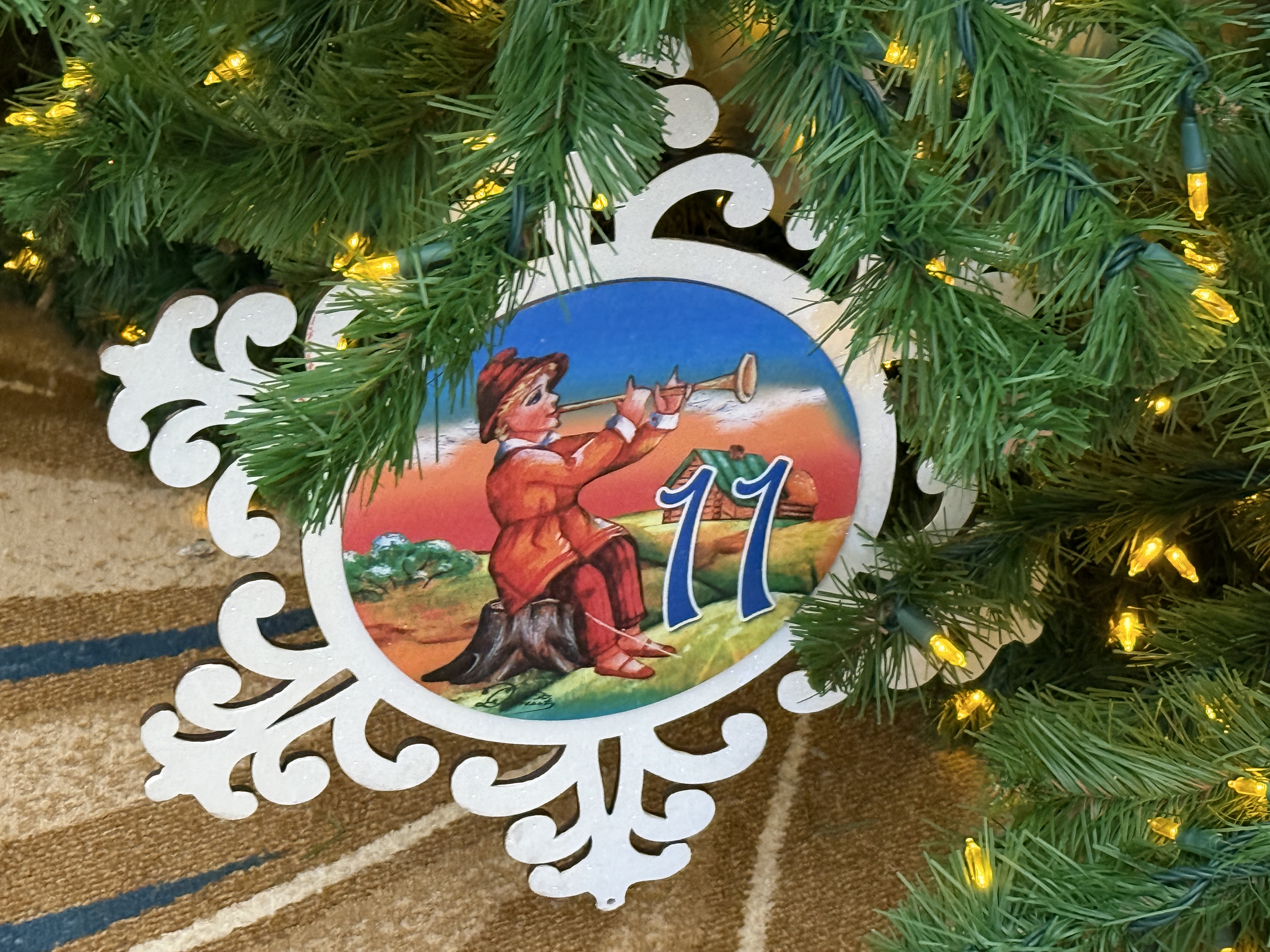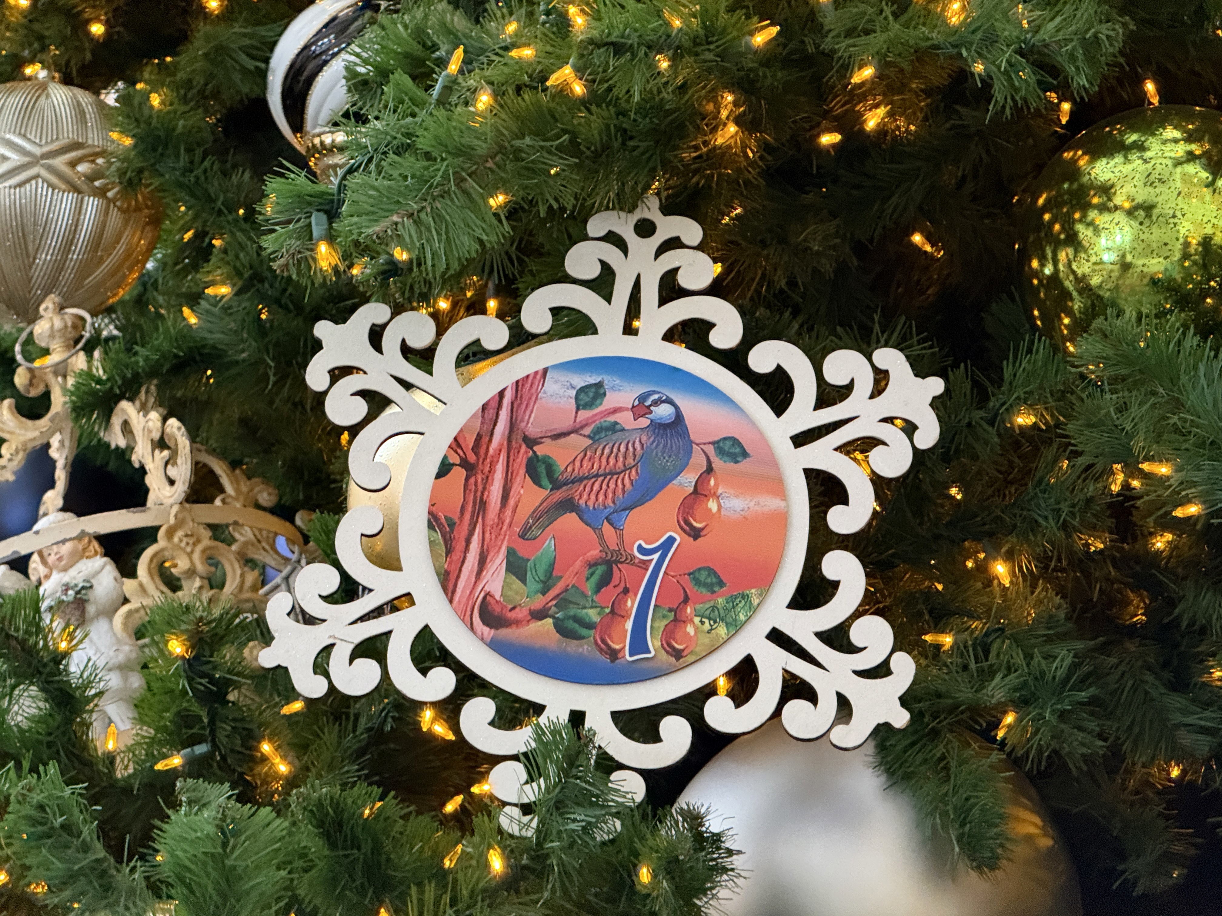 The tree itself features ornaments themed to "The Twelve Days of Christmas."