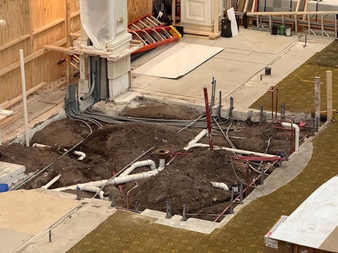 A few months ago, the iconic birdcage structure (which once actually housed real birds) was removed. While the birdcage will not be returning, its design will influence the new bar that is now under construction. The floor has been dug up to allow for electrical work to be done.