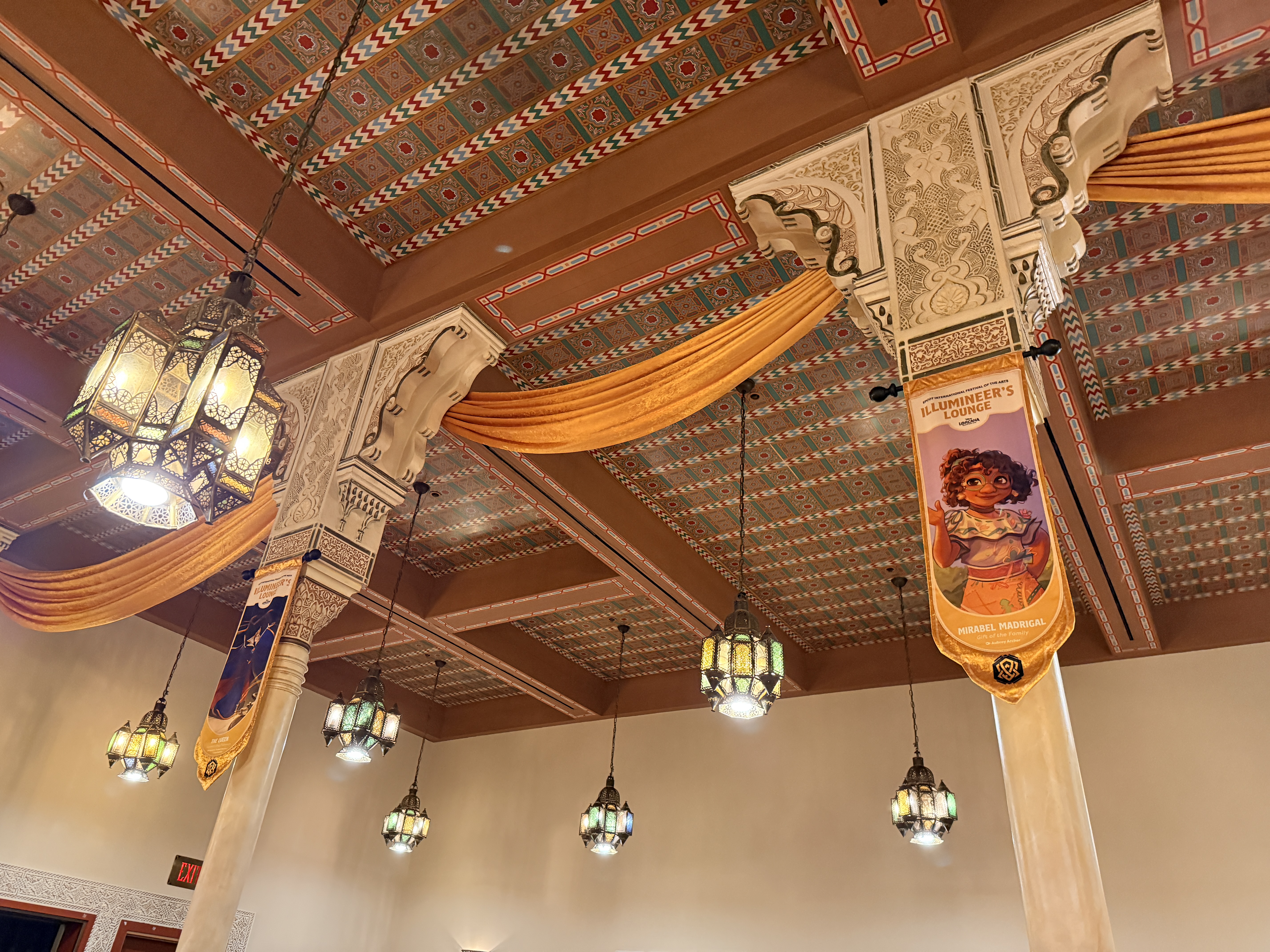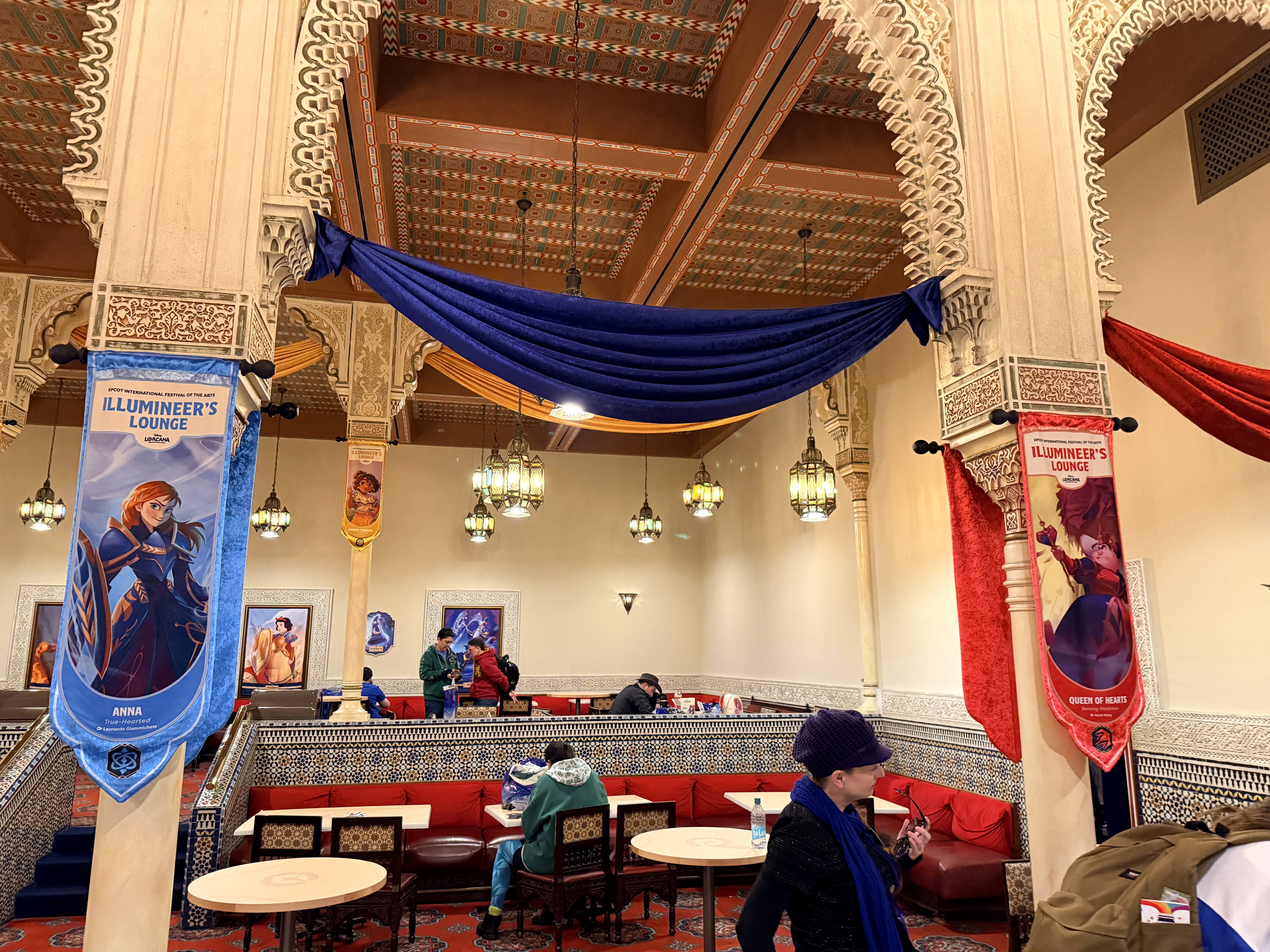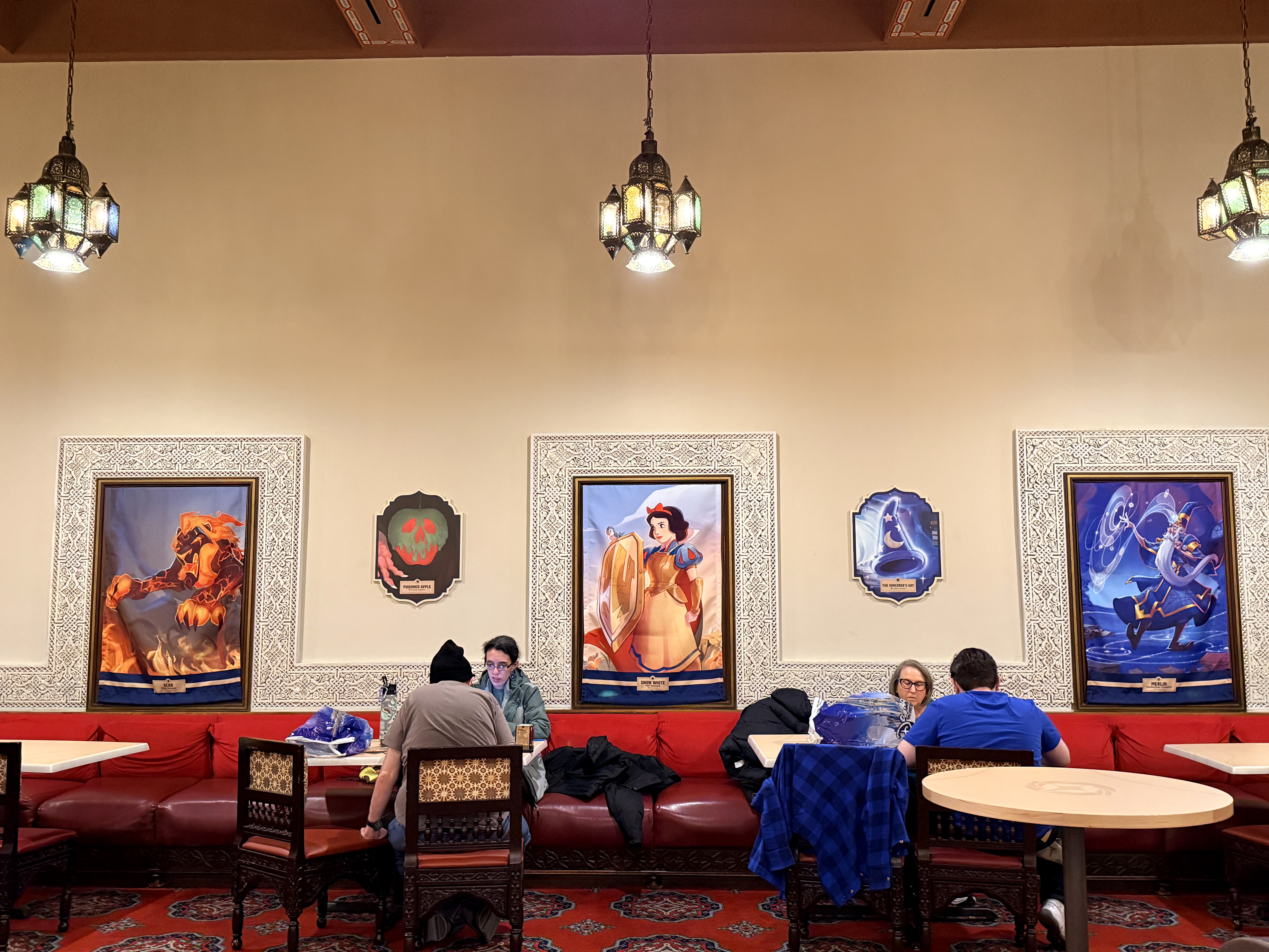 Inside, the former Restaurant Marrakesh is decked out with banners featuring Lorcana card art.