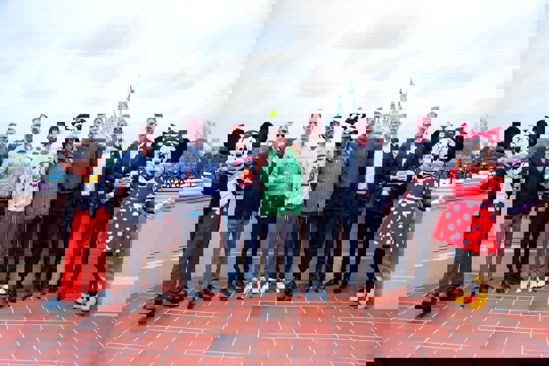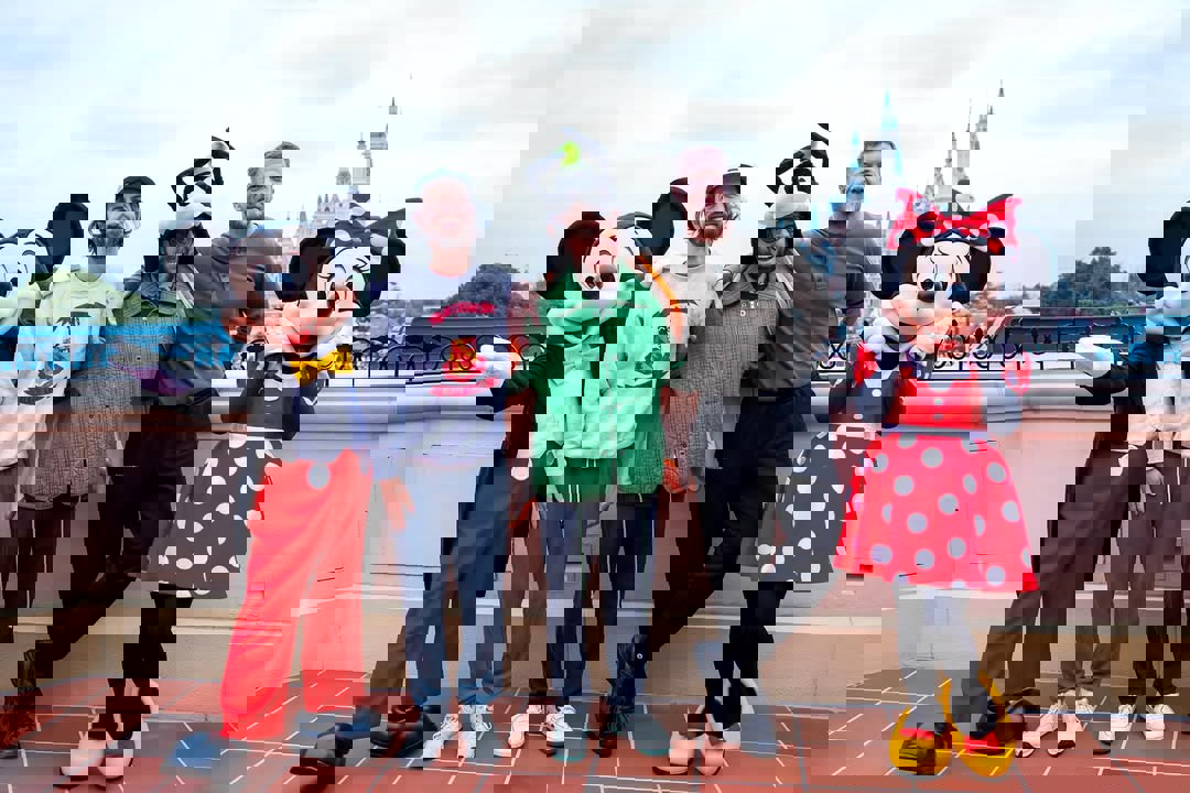 - While there, they posed for a photo with Mickey and Minnie Mouse, alongside some park executives.