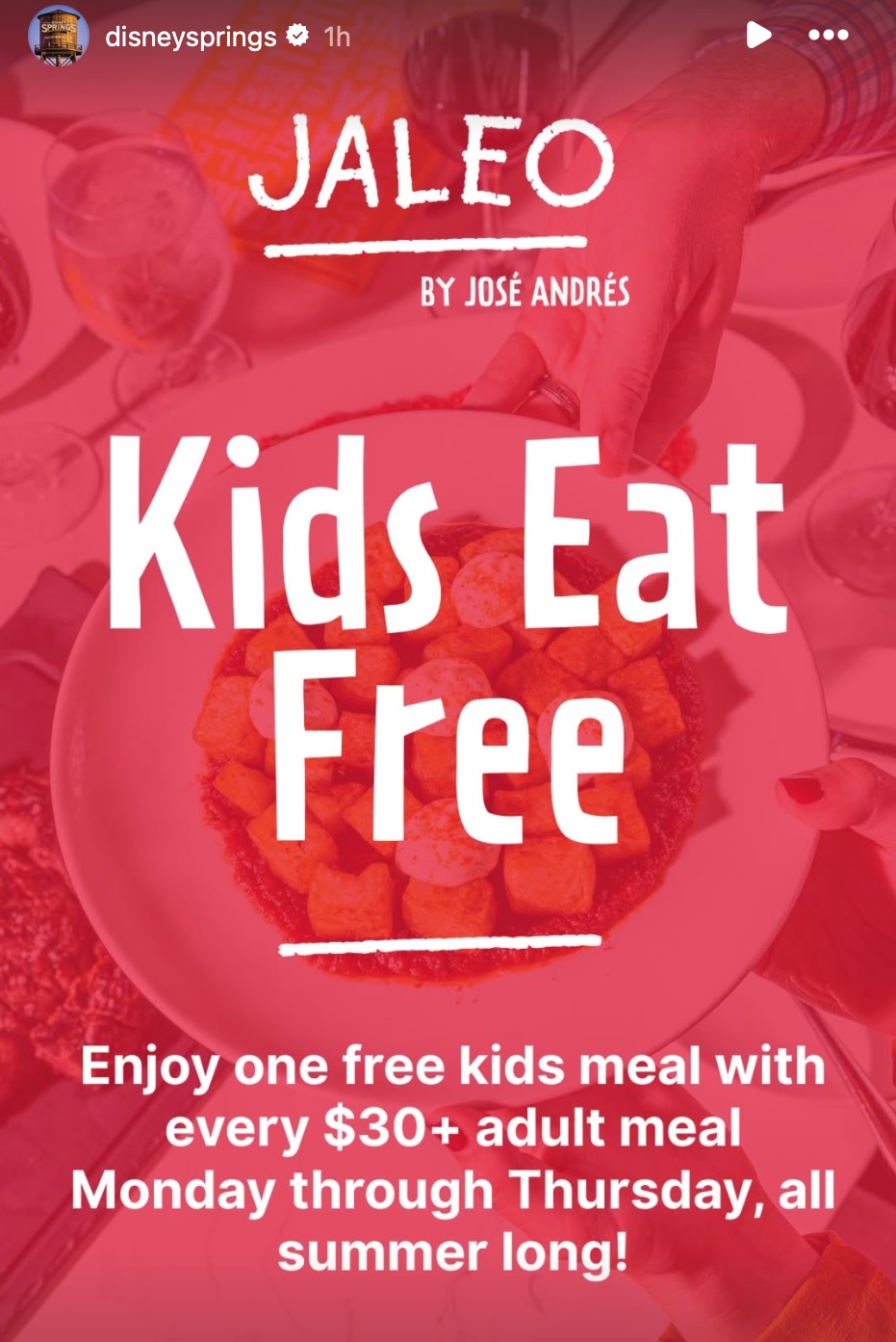 - This summer, kids can enjoy free meals at Jaleo by José Andrés according to a story on Disney Springs Instagram page.