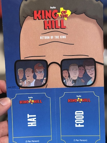 Upon entering, those who stop by will be handed a sheet of tickets that allows them to partake in the various activities offered at the location, as well as some swag and snacks. Sure to be a big draw is a hat station themed to the Mega Lo Mart from the series, where (with their ticket) guests can stop by and pick out their hat color and themed patch (marking a King of the Hill location or brand) and have it made instantly.