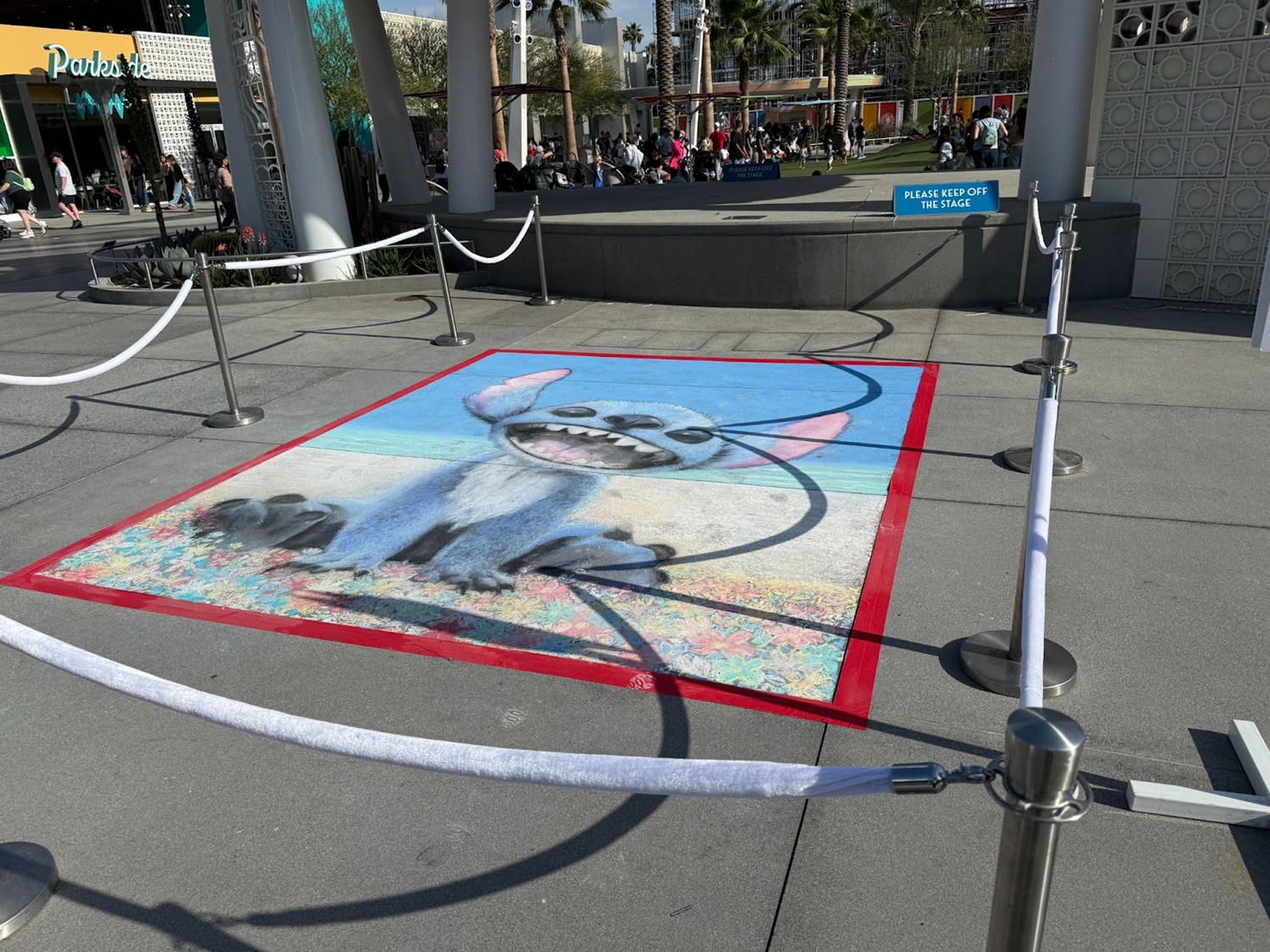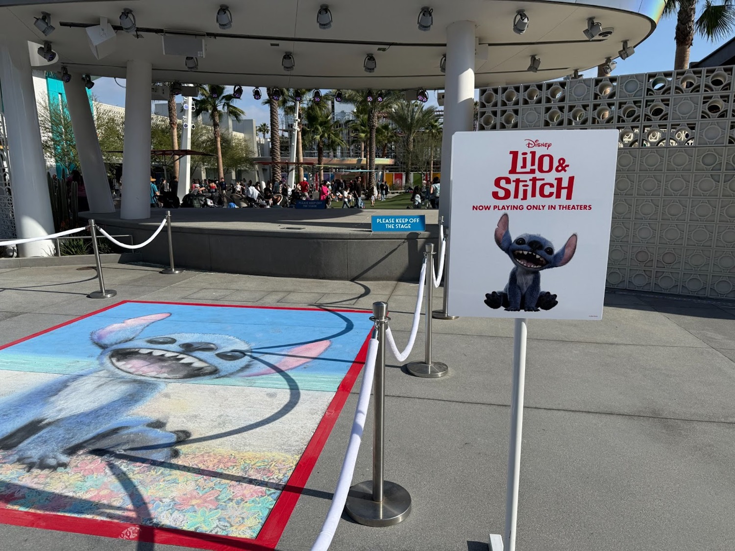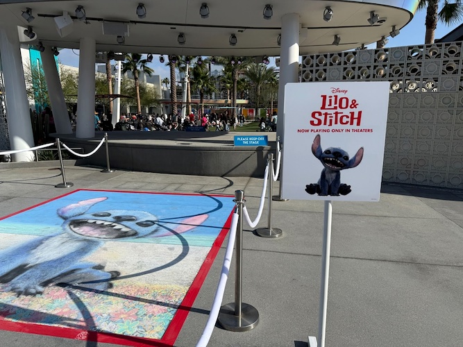 The live-action adaptation of Lilo & Stitch arrived in theaters over the weekend, and Downtown Disney at the Disneyland Resort is getting guests excited for the film with a chalk painting, located on the floor right in front of the Downtown Disney LIVE! Stage.
