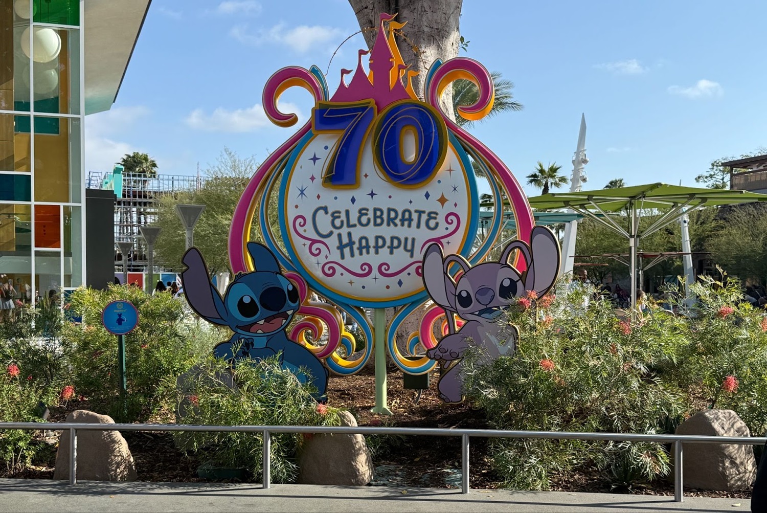 Nearby, the animated versions of Stitch and Angel can be found inviting guests to “Celebrate Happy" as part of decorations for Disneyland’s 70th Celebration.