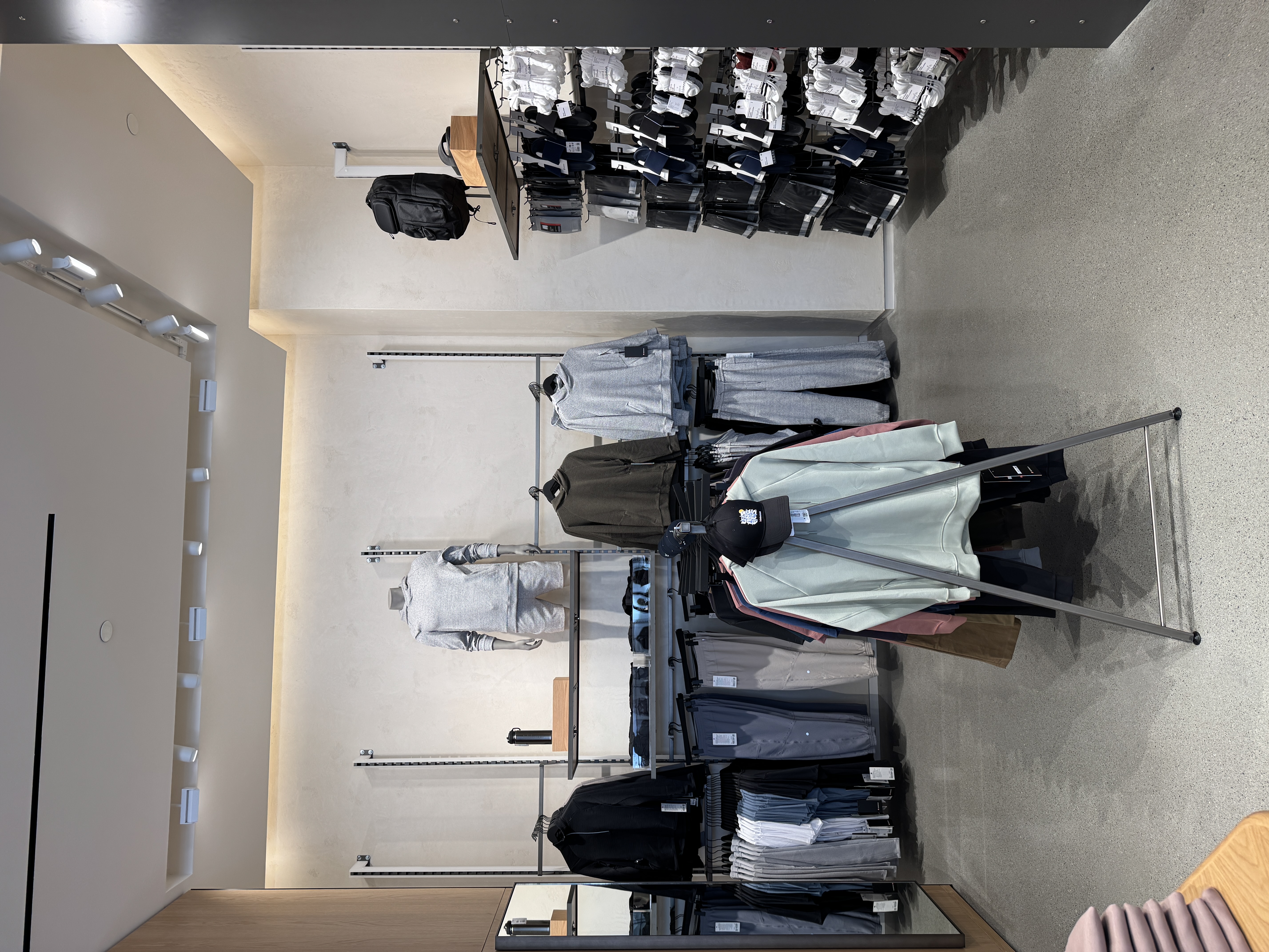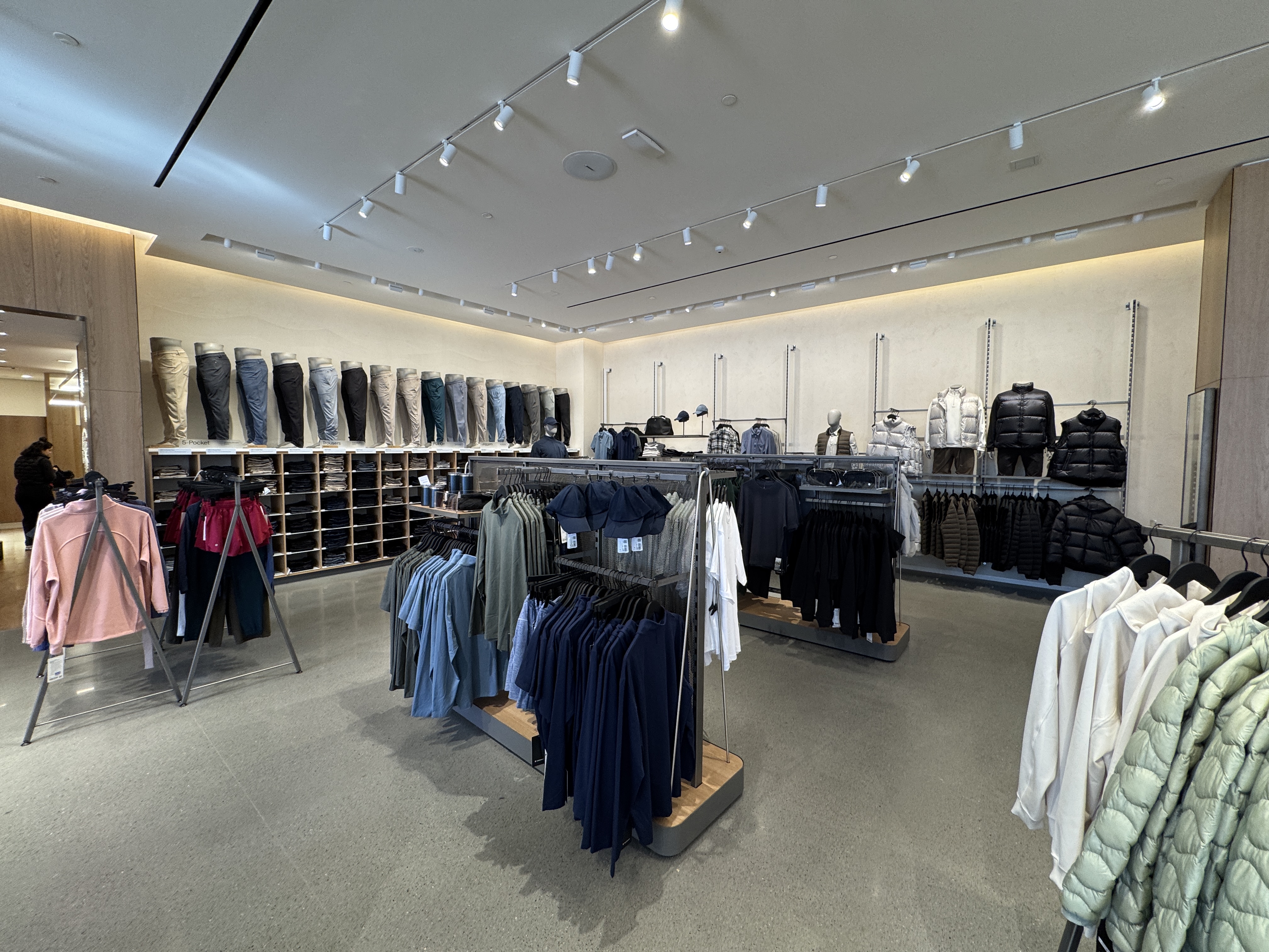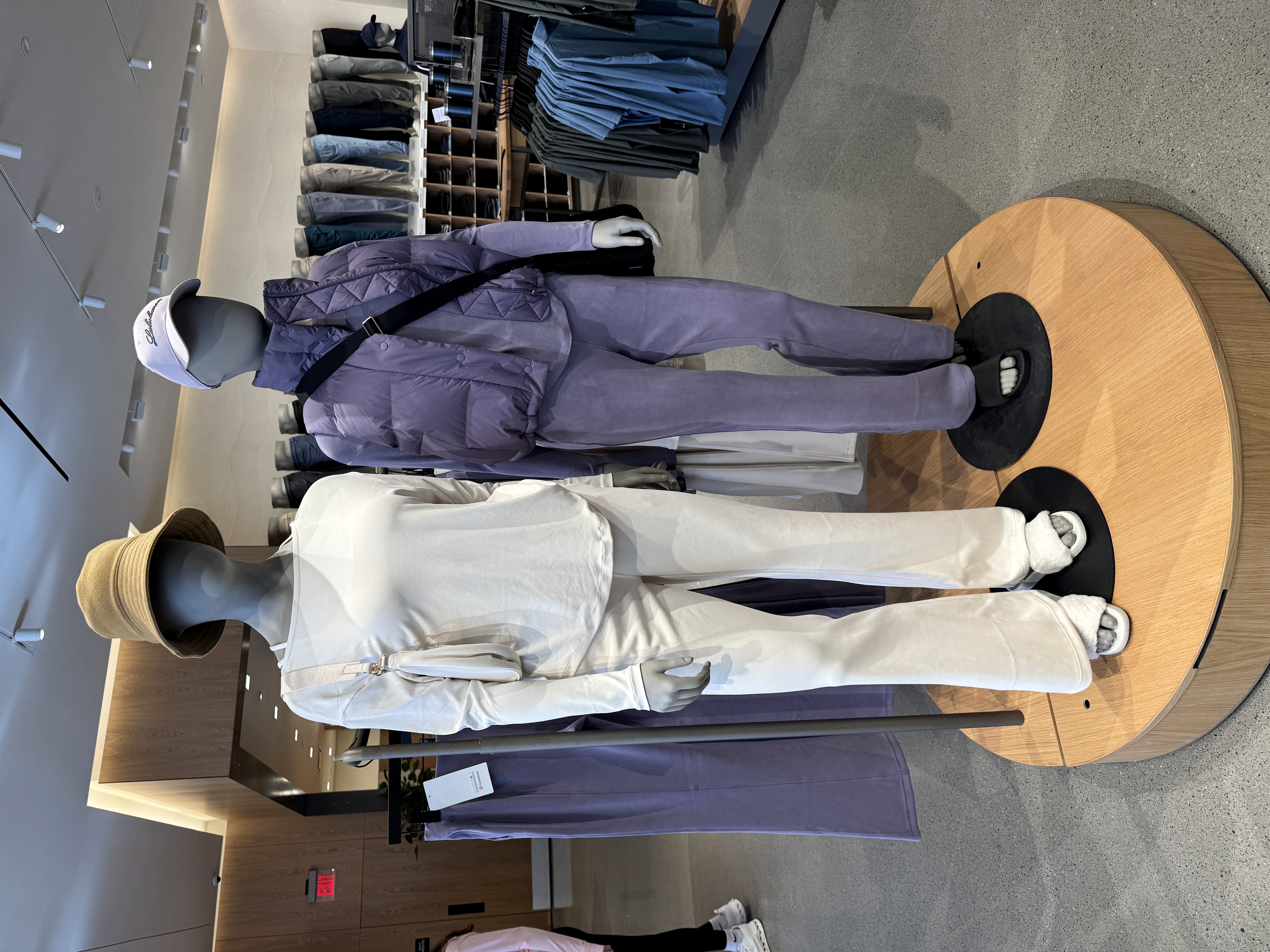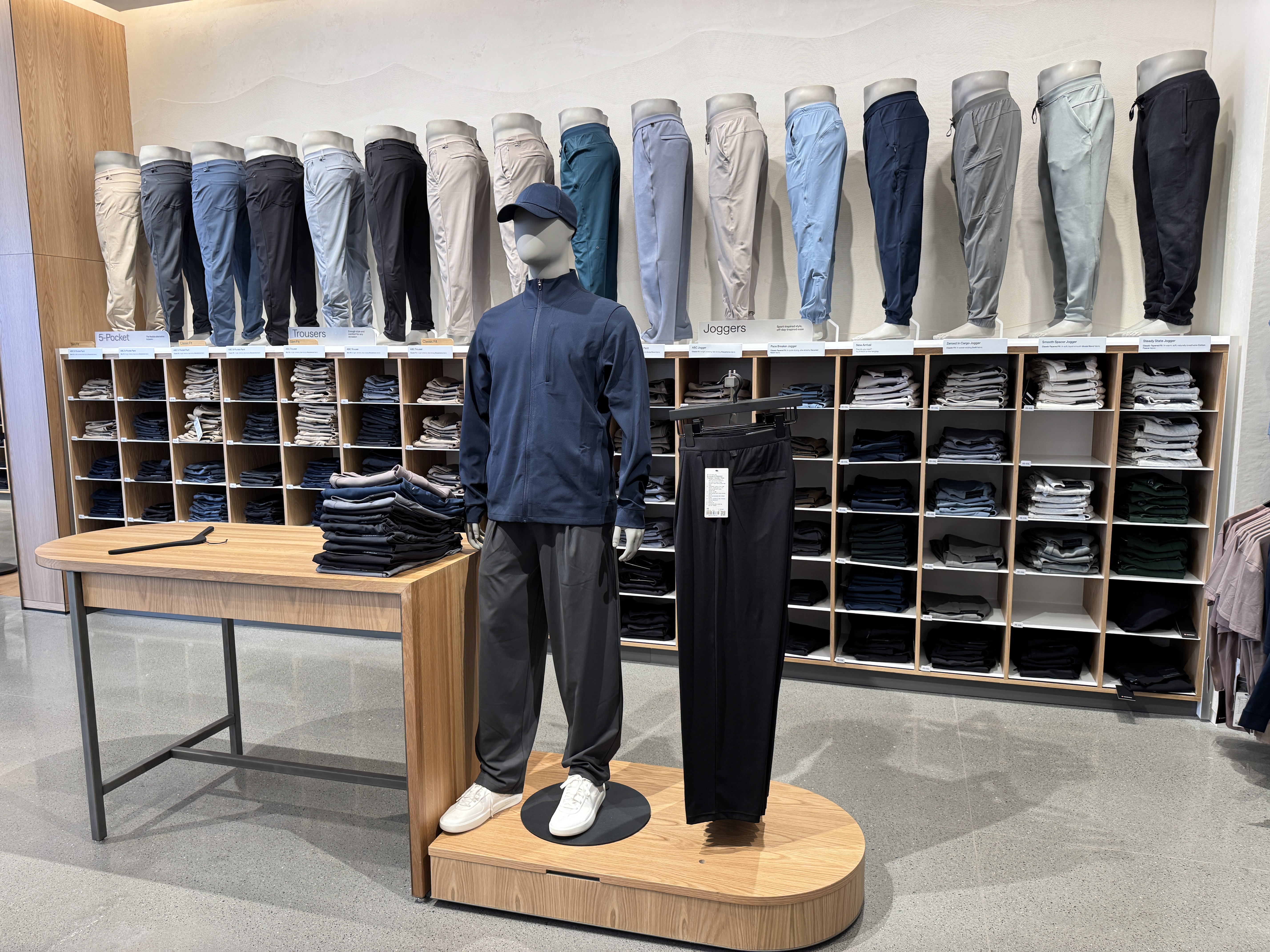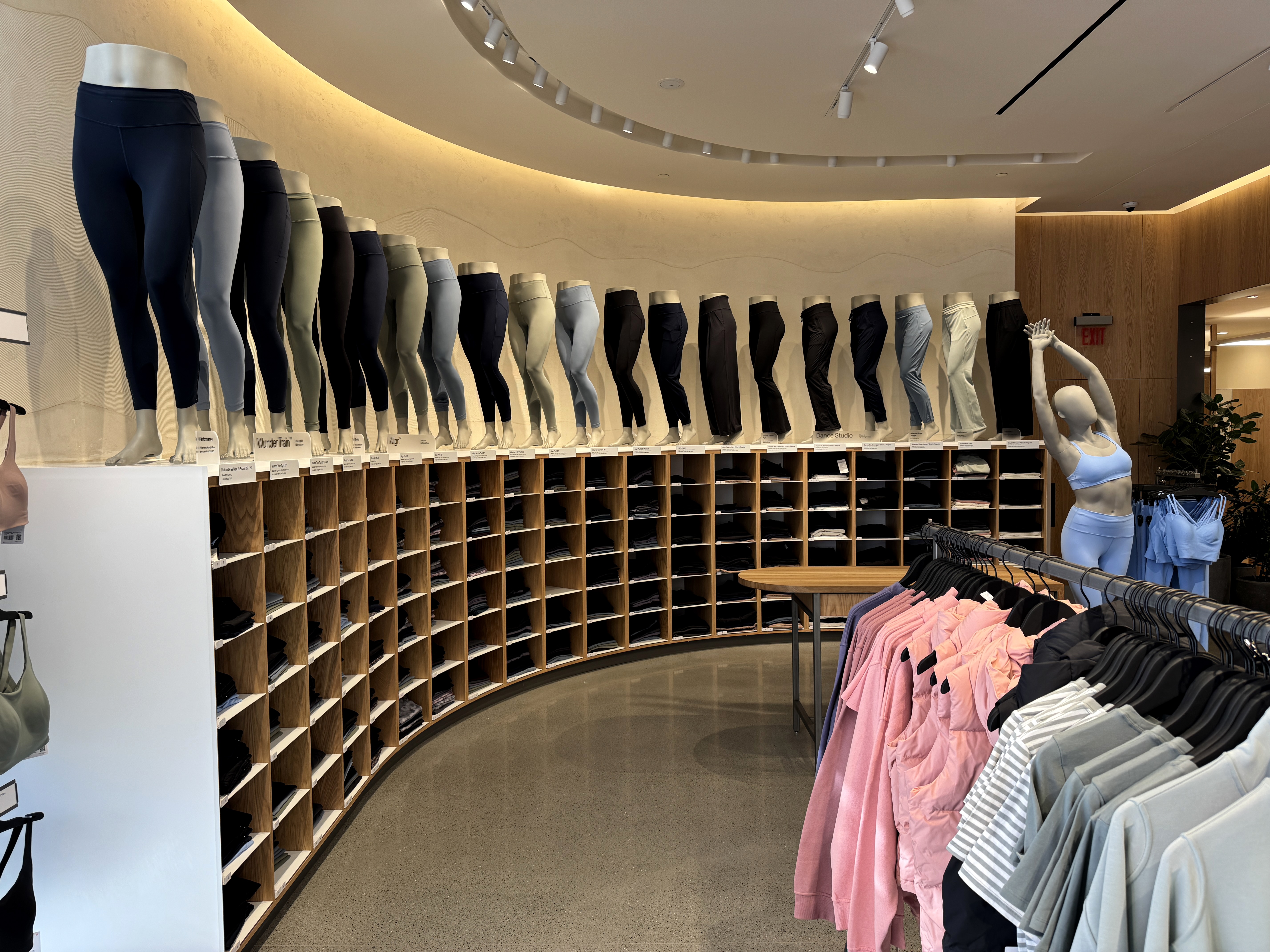 Comfort lovers will immediately be drawn to this impressive wall of leggings and sweatpants.