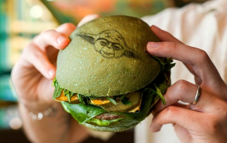 - Yoda Burger: Green bun, beef burger, gouda with green pesto, grilled courgettes, cucumber pickles, rocket salad, sour cream-flavored Doritos, and green pesto sauce (Available starting May 2) (New)