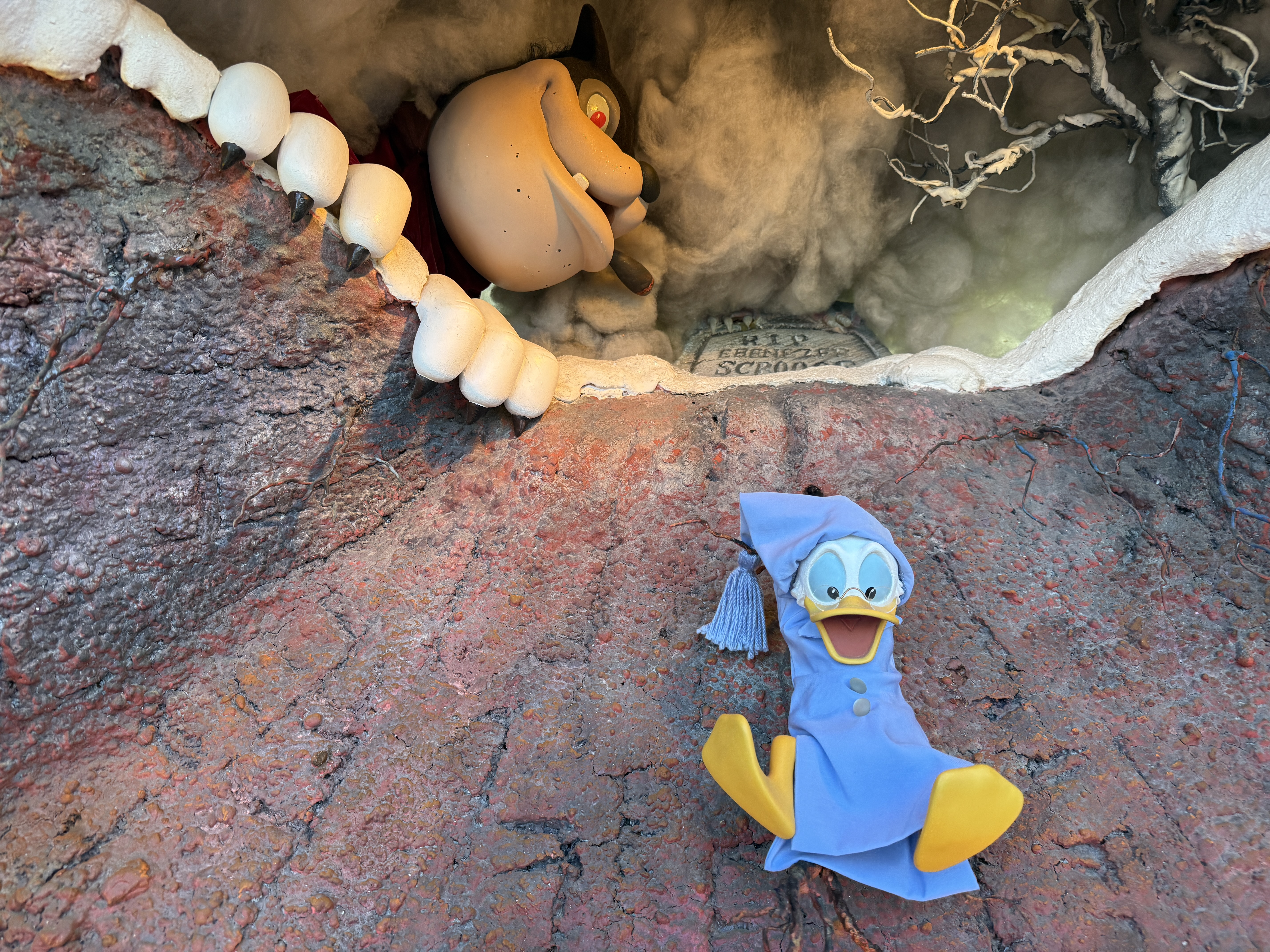 Pete shows up as the Ghost of Christmas Future in a rather distressing scene in both this shop window and the short, as Pete pushes Scrooge into his fiery grave, which appears to lead to the pits of hell. This last encounter is what brings about Scrooge's change.