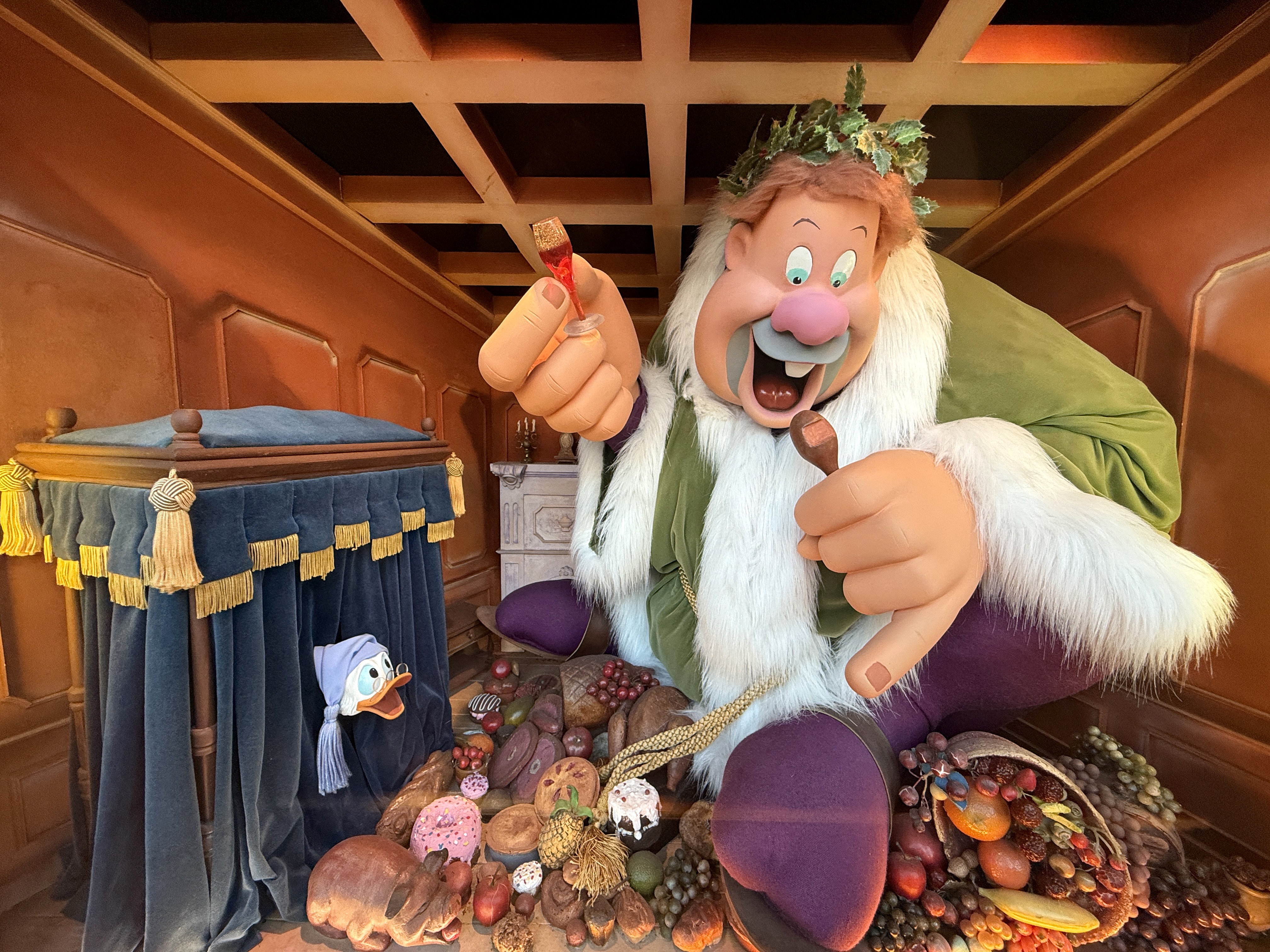 Next, the Ghost of Christmas Present (played by Willie the Giant from Mickey and the Beanstalk) visits Scrooge with his array of appetizing food and tales of psmicashio... pshmsnimanima... uh, yogurt.