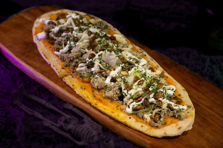 - Grilled Masa Flatbread: Grilled corn cake topped with braised chicken, butternut squash puree, cilantro-pumpkin seed sauce, shredded lettuce, pico de gallo, and queso fresco (Available during Mickey’s Not-So-Scary Halloween Party only)