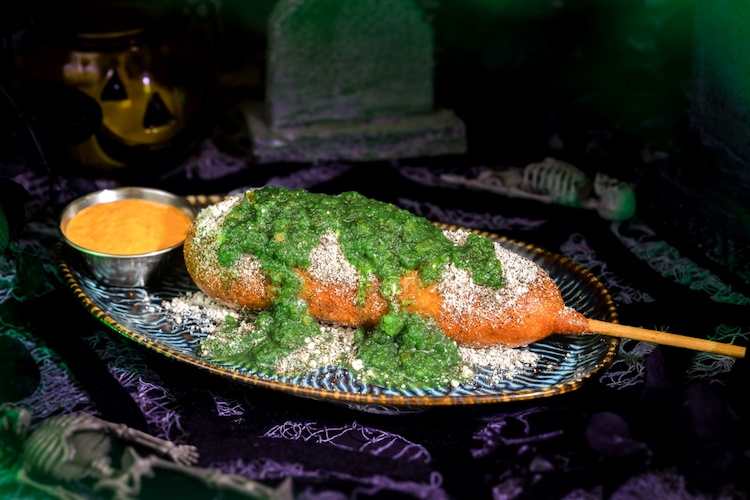 - Creepy Kimchi Corn Dog: Hand-dipped corn dog rolled in malt vinegar and scallion with hades relish and kimchi-mayonnaise dipping sauce (New) (Available during Mickey’s Not-So-Scary Halloween Party only)