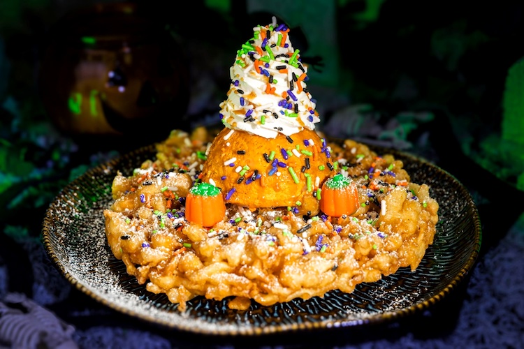 - Pumpkin-spiced Funnel Cake Sundae: Pumpkin funnel cake topped with pumpkin gelato, whipped cream, pumpkin-spiced caramel, marshmallow pumpkins, and sprinkles (New) (Available during Mickey’s Not-So-Scary Halloween Party only)