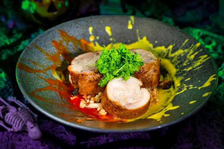 - Chicken Roulade: Chicken stuffed with mousseline and black truffles over fregola pasta with aji amarillo and red pepper sauces (New) (Available during Mickey’s Not-So-Scary Halloween Party only)