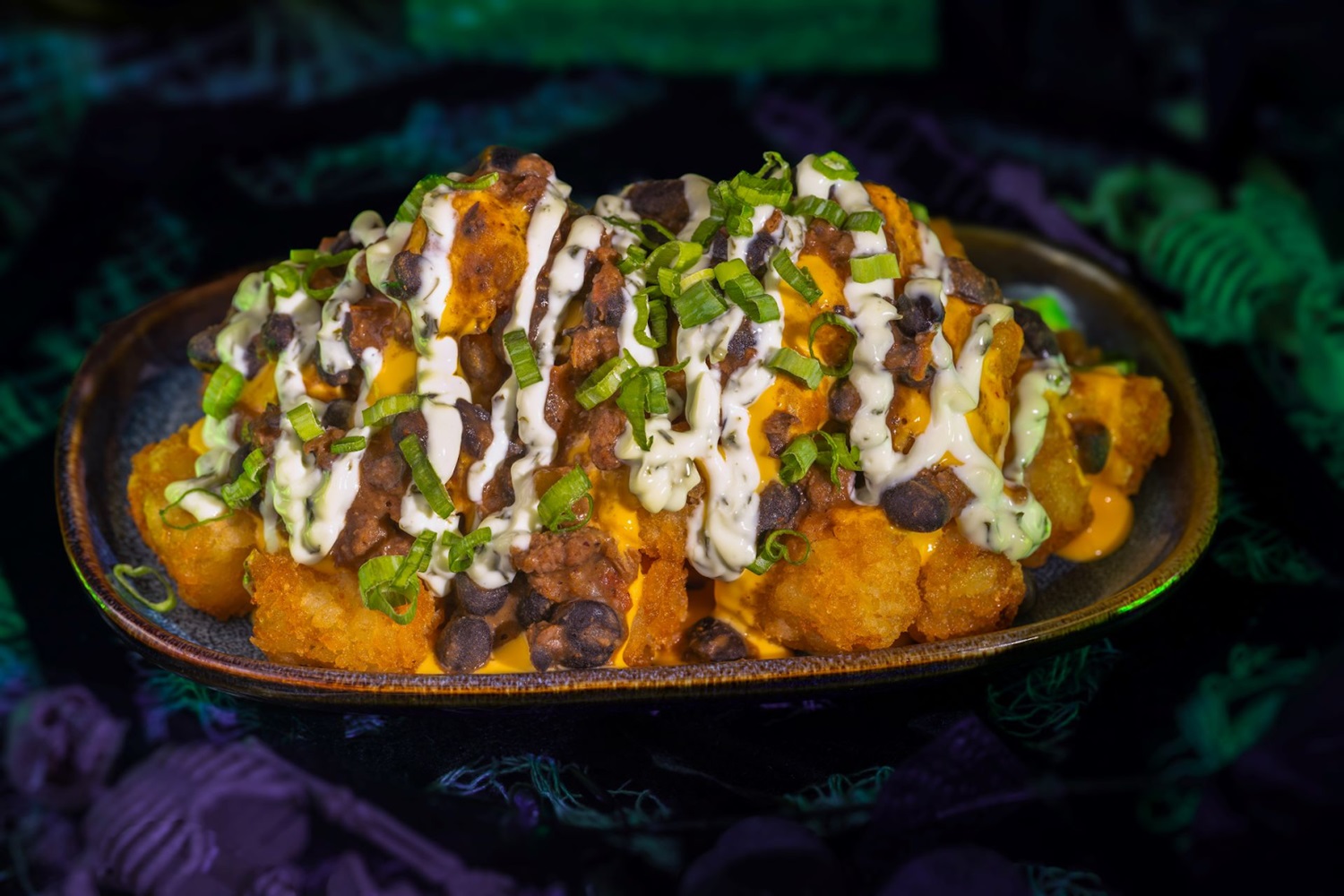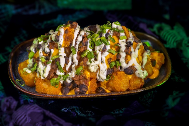 - Haunting Jalapeño Ranch Tots: Tots topped with black bean chili, cheddar cheese sauce, and jalapeño ranch (New) (Available during Mickey’s Not-So-Scary Halloween Party only)
