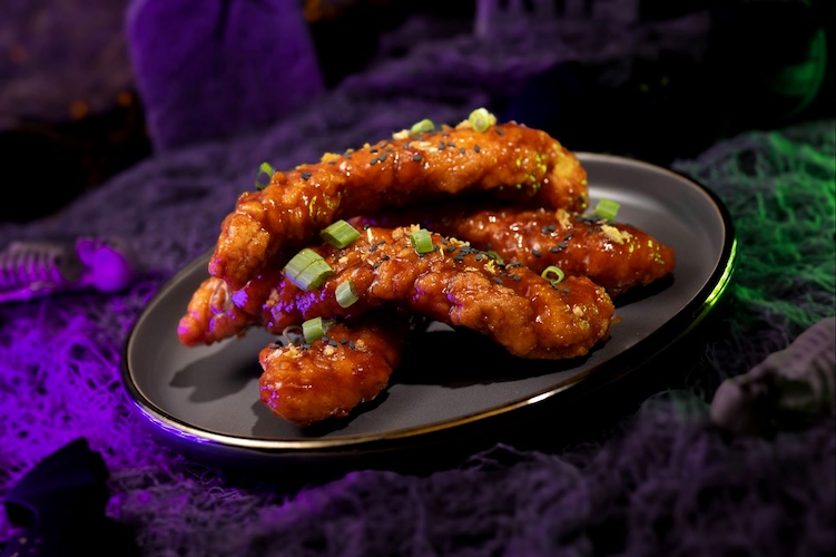 - Sweet-and-Spicy Chicken Strips drizzled with Korean barbecue sauce and topped with black sesame seeds, fried garlic, and green onions (Available during Mickey’s Not-So-Scary Halloween Party only)