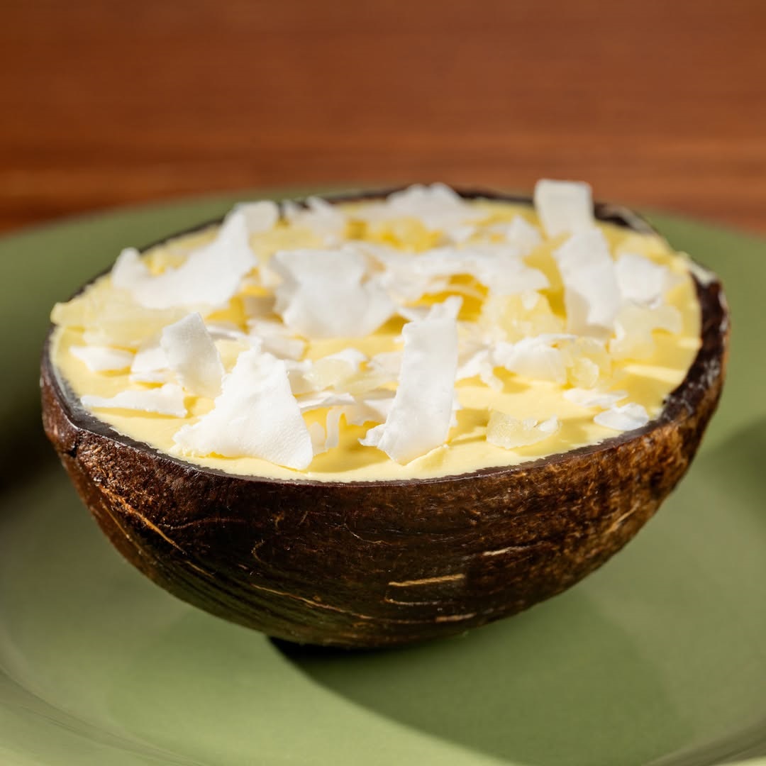 - Inside the coconut, you will discover a refreshing coconut-pineapple sorbet complemented by candied pineapple chunks that add a touch of sweetness, along with coconut flakes that provide both crunch and a chewy texture.