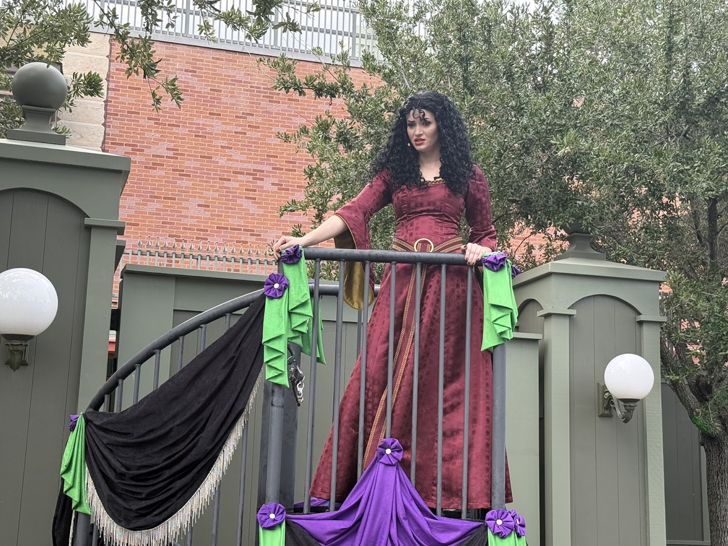 - Said list notes that Mother Gothel will be appearing in Mickey’s Boo-To-You Halloween Parade, but doesn’t list her as a meet and greet character. We, however, found her talking to guests as they entered the event via the Main Street bypass.