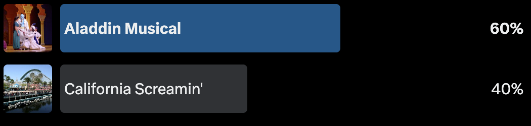 Our final match-up featured California Screamin' from the Rethemed Region versus the Shows & Entertainment Region's Aladdin: A Musical Spectacular. Voting was close for a while but, in the end, the Genie worked his magic and Aladdin was able to pull out a win.