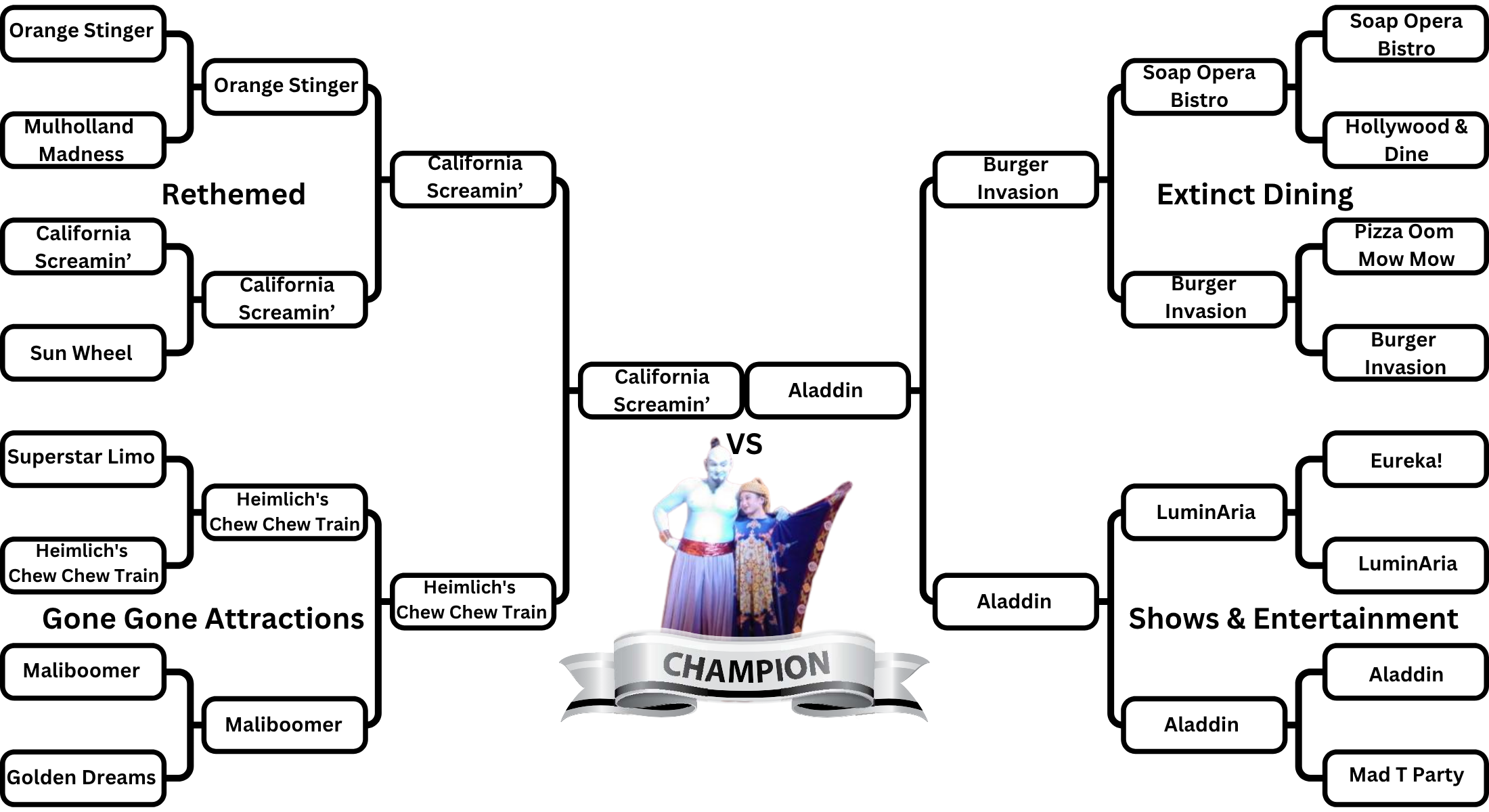 Our final match-up featured California Screamin' from the Rethemed Region versus the Shows & Entertainment Region's Aladdin: A Musical Spectacular. Voting was close for a while but, in the end, the Genie worked his magic and Aladdin was able to pull out a win.