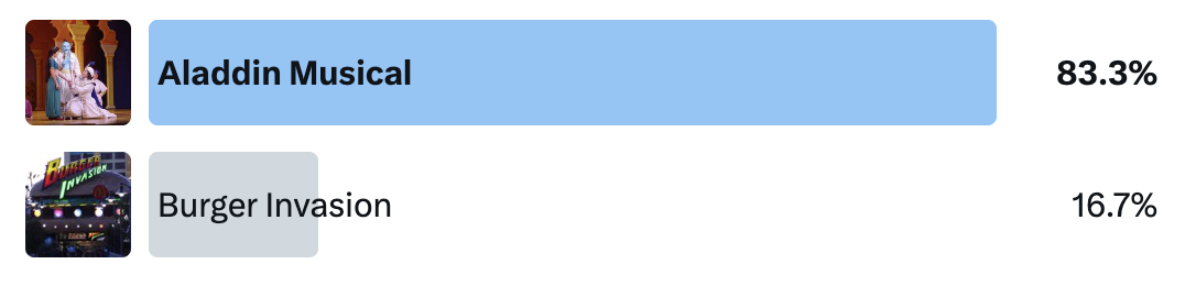 Before we get into today's matchup, let’s take a look at the previous poll's results. In a not-unexpected result, Aladdin: A Musical Spectacular (the winner from our Shows & Entertainment Region) demolished the representative from the Extinct Dining Region, Burger Invasion.