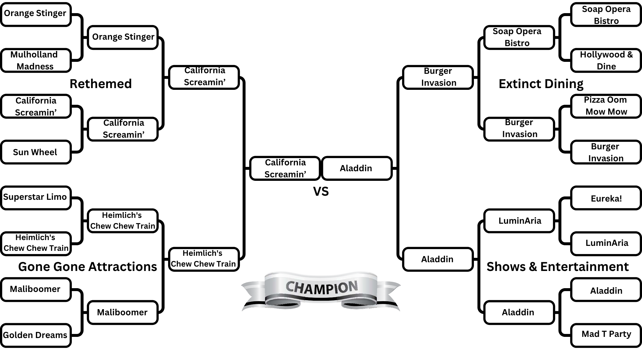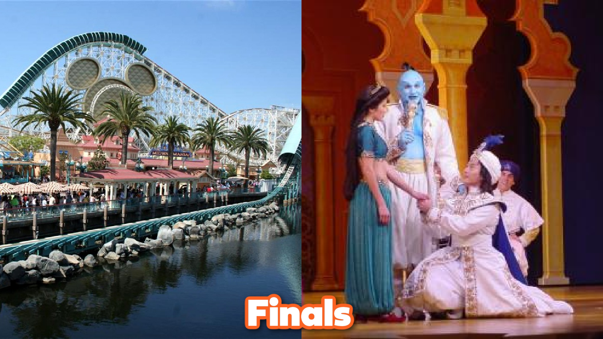 With that, it's time for the grand finale. On one side, we have the beloved but since rethemed California Screamin'. On the other side, the long-running Aladdin: A Musical Spectacular.