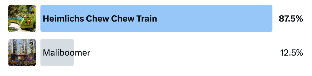 Before we get into today's matchup, let’s take a look at the previous poll's results. Heimlich's Chew Chew Train ate up the Maliboomer like a burrito (or a Malibu-Rito, since DCA used the same city pun twice).
