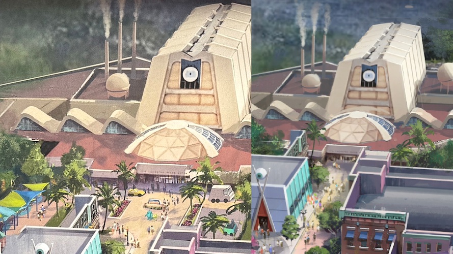 The entrance area to the Monsters Inc. Door Coaster has been expanded in the new art, creating a plaza in front of the building. A few vehicles can be seen parked out front, and what appears to be a children’s play area of some sort can be seen off to the left.