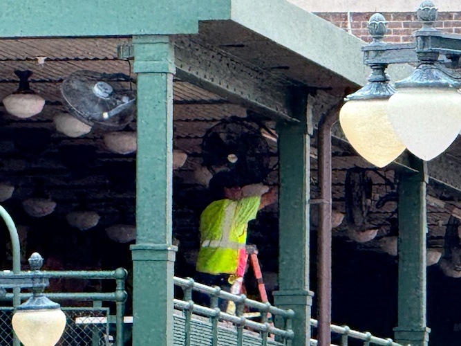 Over at PizzeRizzo, we spotted construction workers starting to take down fans and light fixtures from the second-level outdoor seating section.