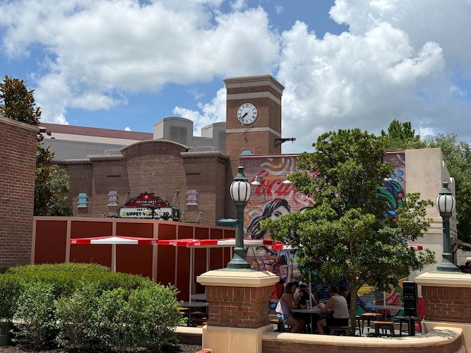 Thousands of Muppets fans showed up on Saturday to say farewell to Muppet*Vision 3D after nearly 35 years of operation at Disney’s Hollywood Studios. The following day, rolling planters blocked off access to the area to allow for a cast member farewell party on Tuesday. Now that the party is over, construction walls have gone up, teasing what’s to come.