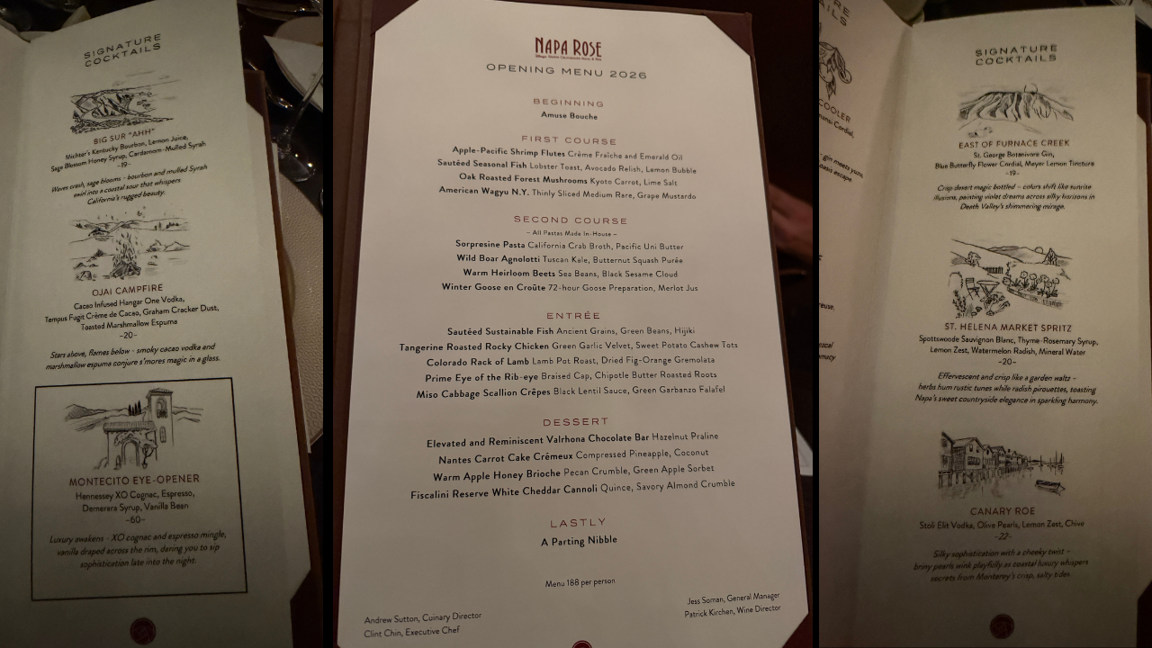 In his full review of the renovated Napa Rose, Laughing Place's Ben Breitbart had nothing but great things to say about the food, including the desserts prepared by executive pastry chef Jorge Sotelo and pastry chef Nubia Renteriaas And you can get a better look at some of those food and drink selections below.