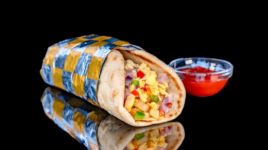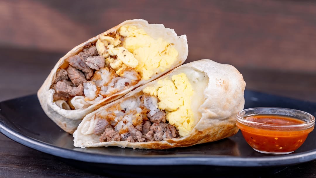 • Carne Asada Breakfast Burrito at Cappuccino Cart: Marinated steak, scrambled eggs, Monterey jack, and potato bites