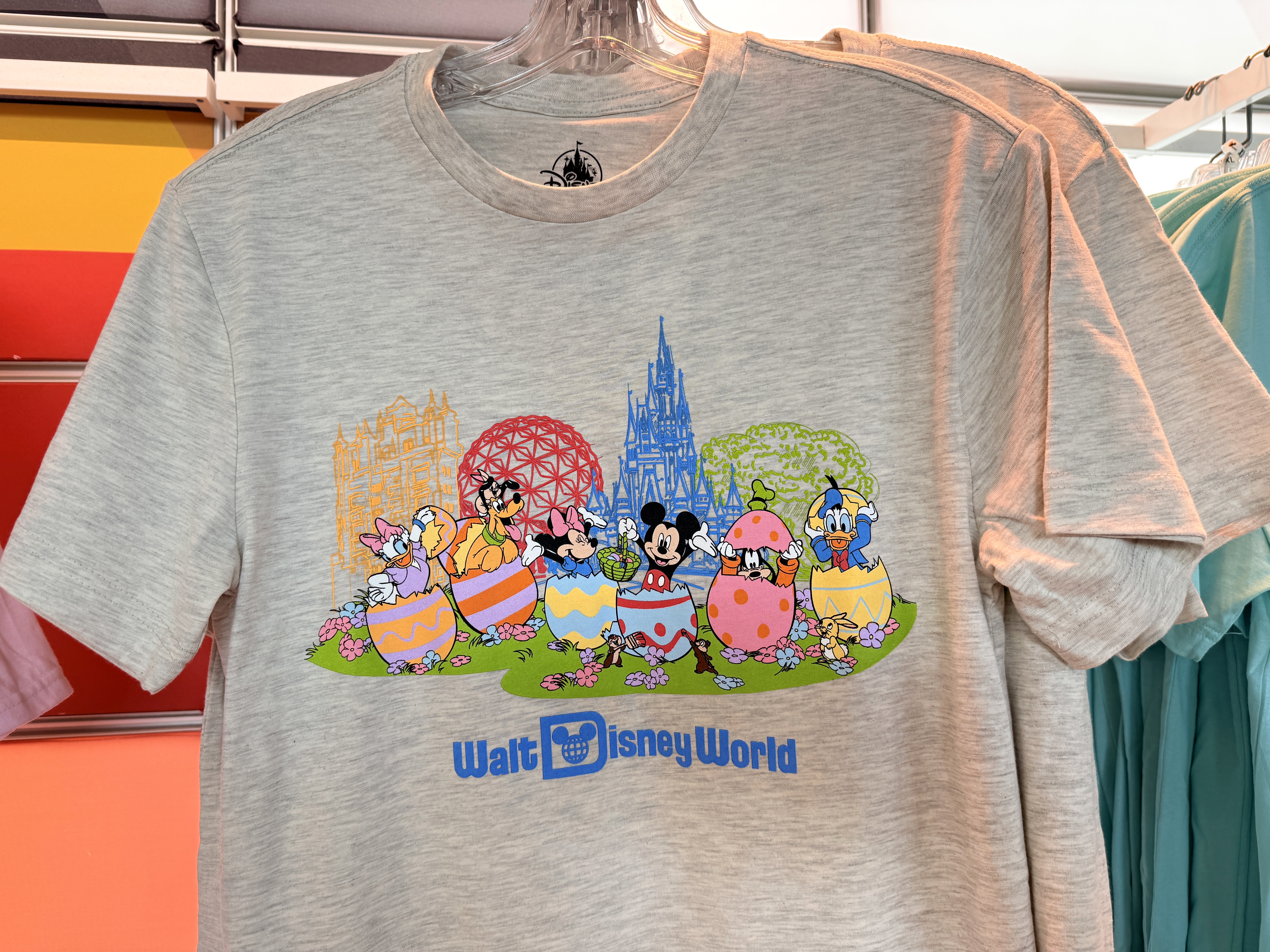 An Easter-themed shirt has Mickey Mouse, Minnie Mouse, Goofy, Donald Duck and Daisy Duck bursting out of eggs.