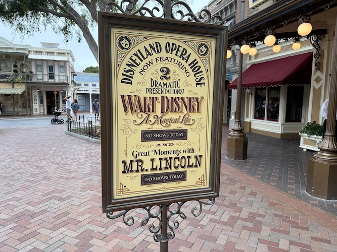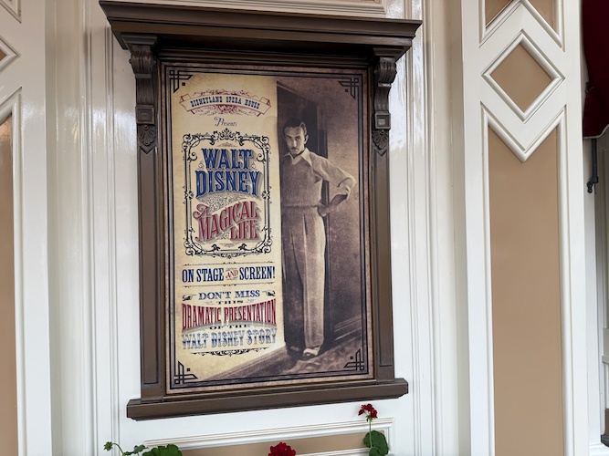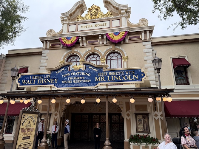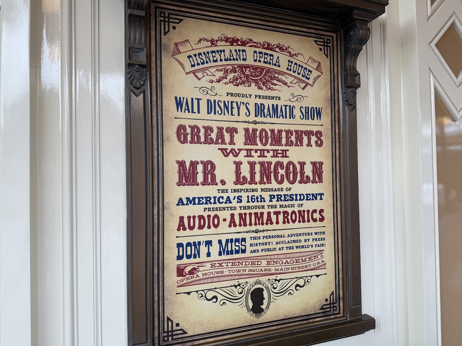 Immediately upon entering, guests will notice the new marquee on the opera house, with that attraction posters for both Great Moments with Mr. Lincoln and Walt Disney - A Magical Life, flanking either side of the entrance doors to the Opera House. This is because after its initial run, Walt Disney - A Magical Life will alternate performances with the classic Great Moments with Mr. Lincoln.
