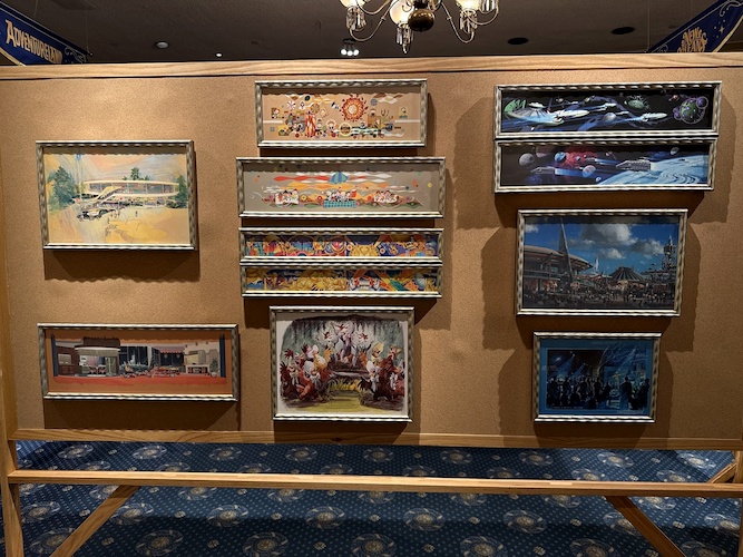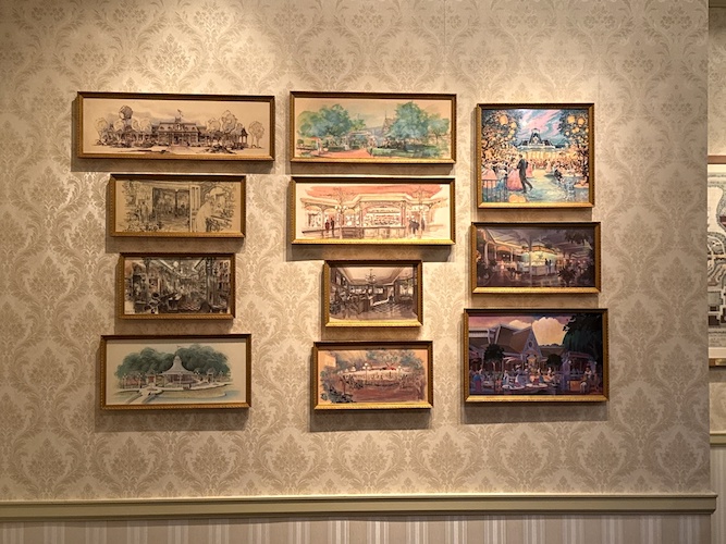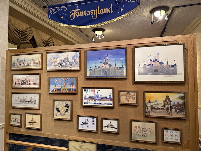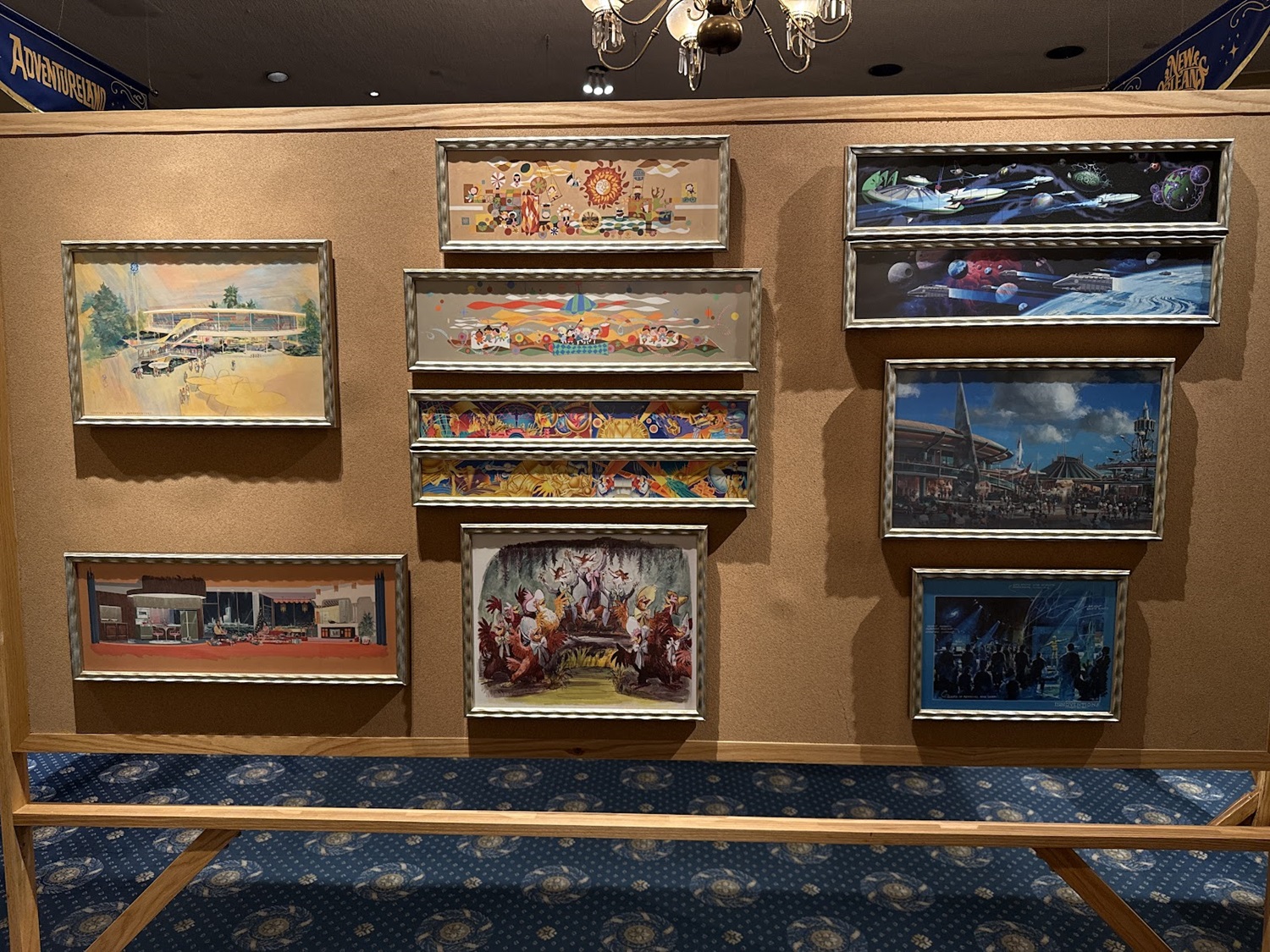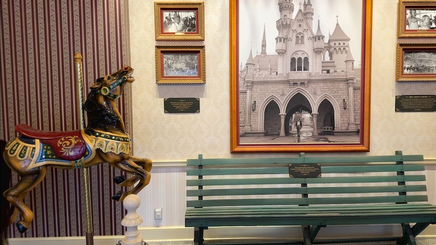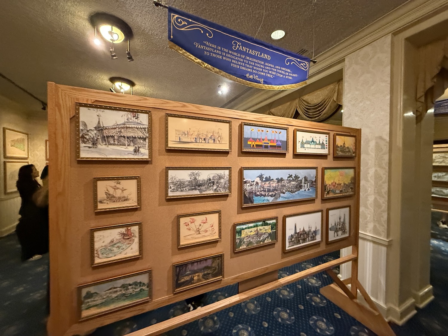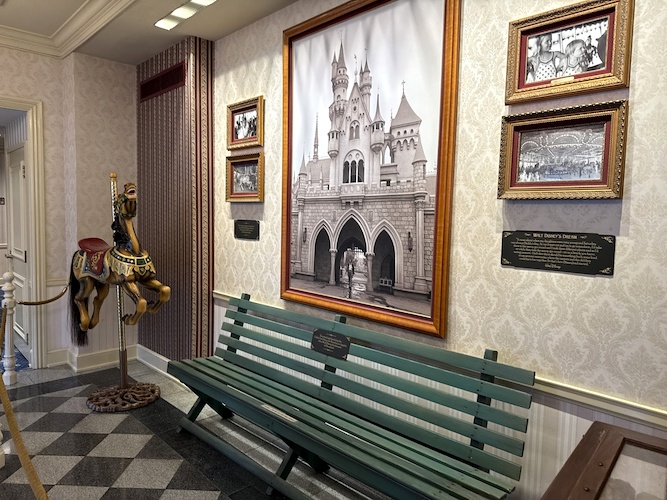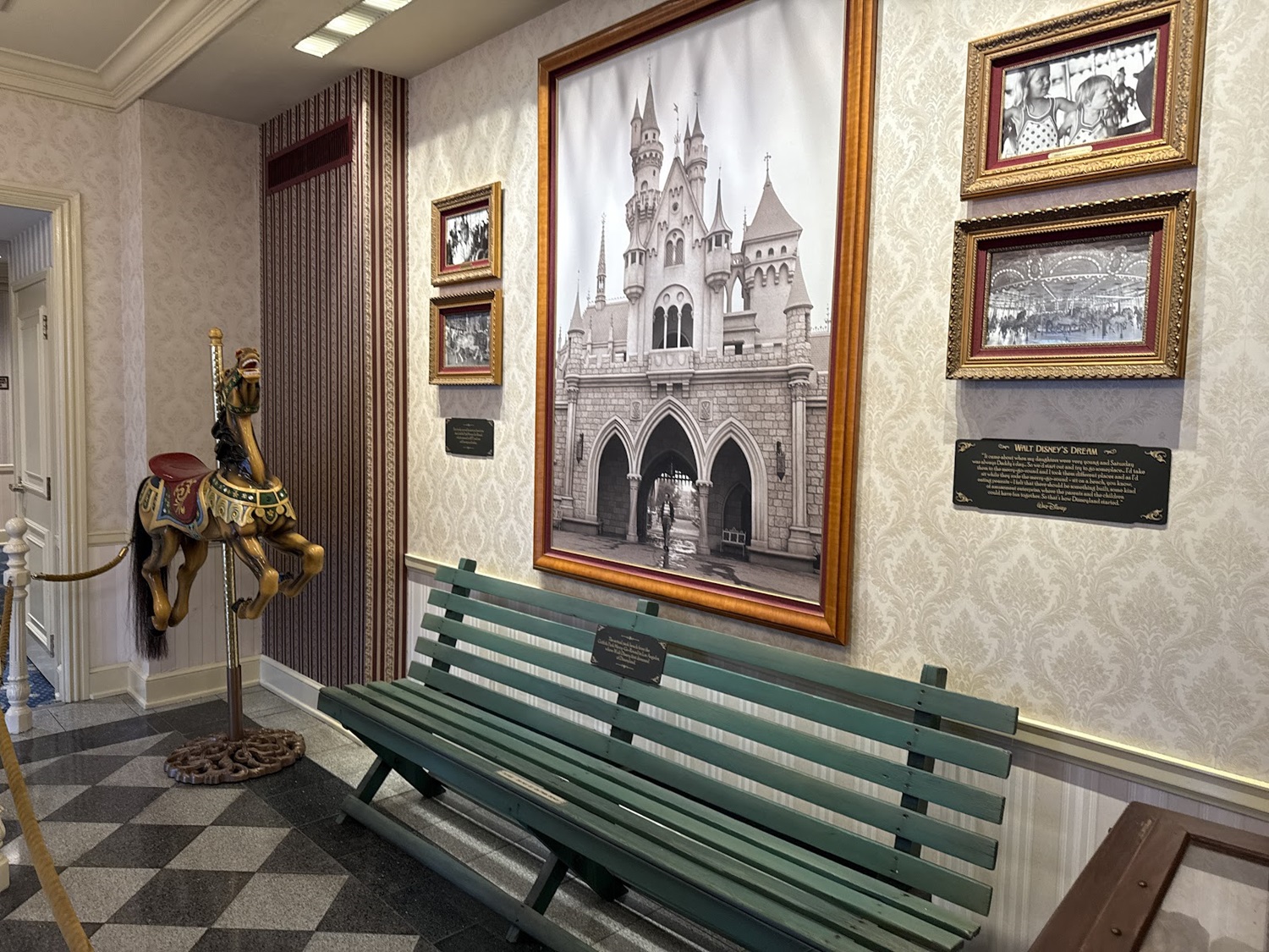 Once inside, guests can spot the original bench that Walt Disney was sitting on when he thought of Disneyland that has been in the lobby for quite some time. From there, it's a numerous set of displays celebrating each land of the park and art for their attractions and experiences.