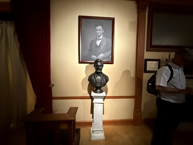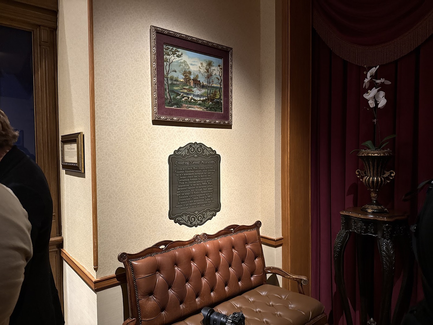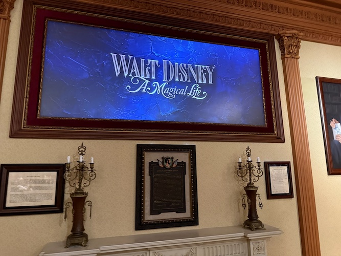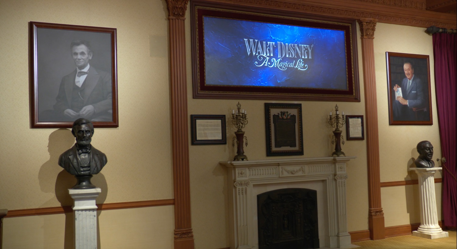 A screen closer to the theater is anchored on either side by a bust and portrait of Abraham Lincoln, and the same of Walt Disney on the either. A sort of pre-show plays for Walt Disney - A Magical Life, as well as marking how long before the next show begins. Presumably this will alternate with a Lincoln-based pre-show idea when the two shows alternate in the future.