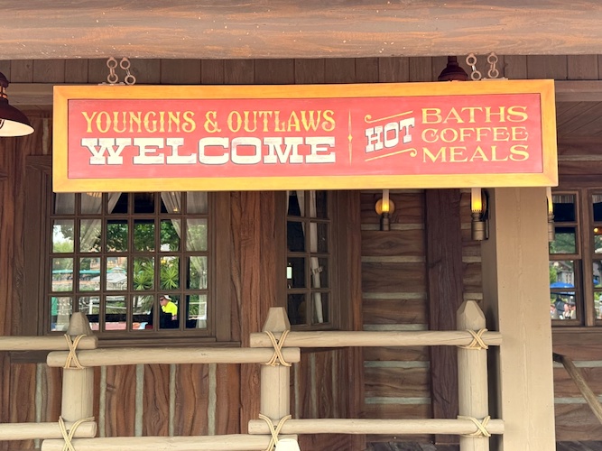 - The new sign added to the exterior of McKim’s Mile House reads “Younglings & Outlaws Welcome Hot Baths Coffee Meals."