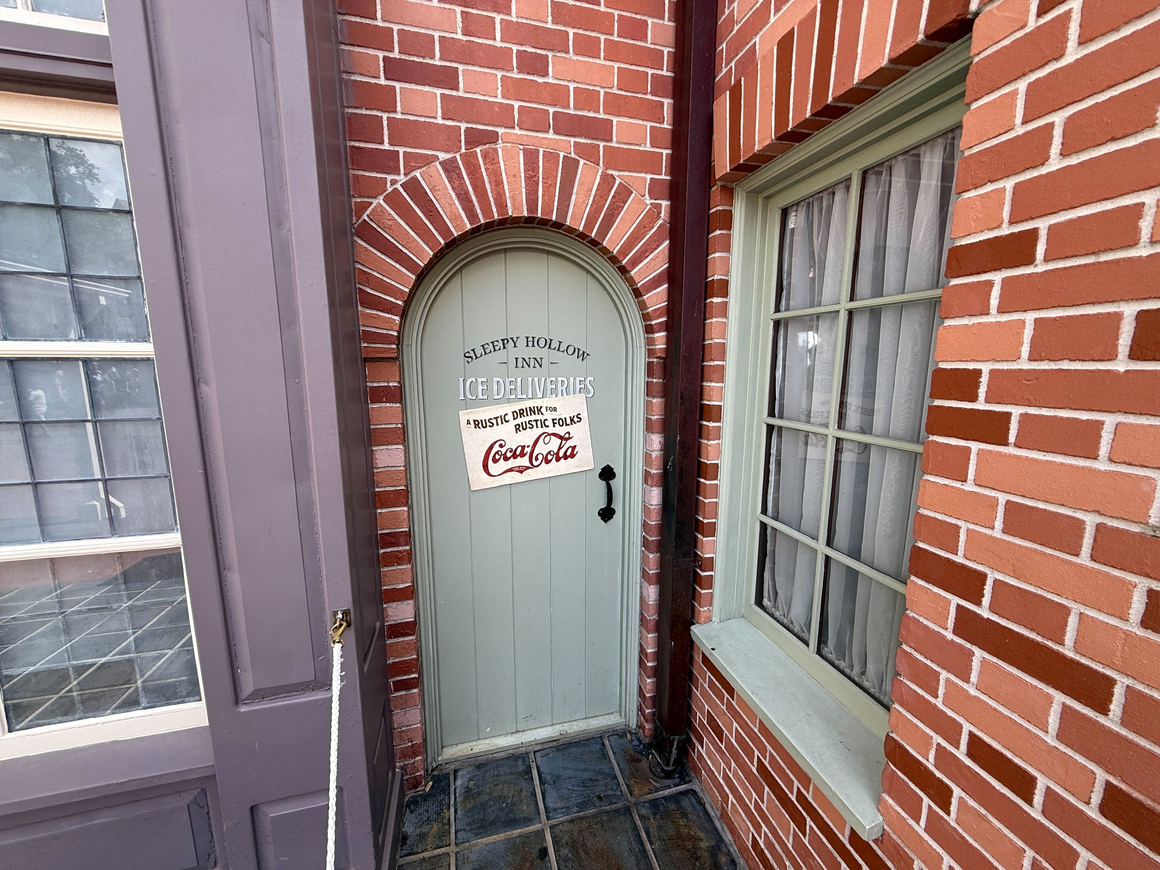 Following the installation of new signage for the restaurant itself last year, a themed door has received new signage reflecting the location's Coca-Cola sponsorship. The door is set aside for Ice Deliveries to Sleepy Hollow, with a Coca-Cola sign on top saying "A Rustic Drink for Rustic Folks."