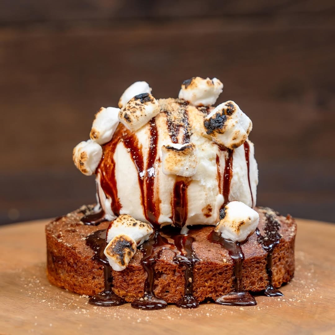 - Chocolate butter cake topped with vanilla ice cream, chocolate sauce, graham cracker crumbs, and toasted marshmallow