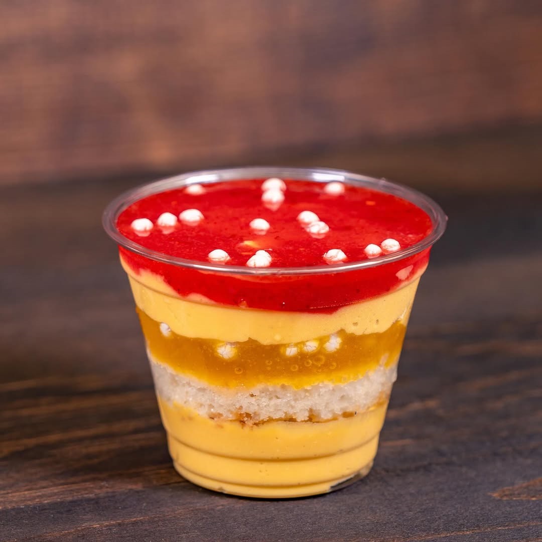 - Mango mousse, vanilla cake, mango passion fruit compote, and strawberry chamoy chile-lime gelée
