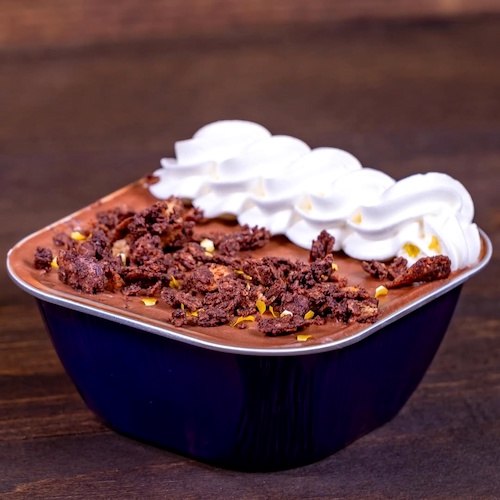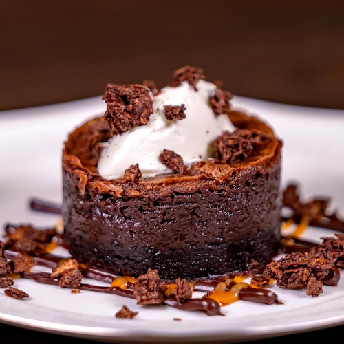 - Chocolate brownie molten cake, Chantilly cream, caramel, and chocolate sauce garnished with chocolate rice crisp