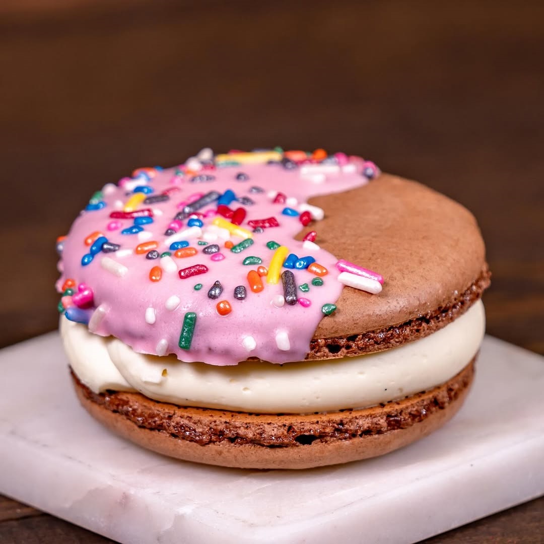 - Chocolate macaron with vanilla bean buttercream and strawberry sauce at Clarabelle’s Hand-Scooped Ice Cream