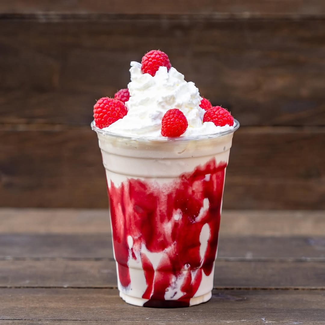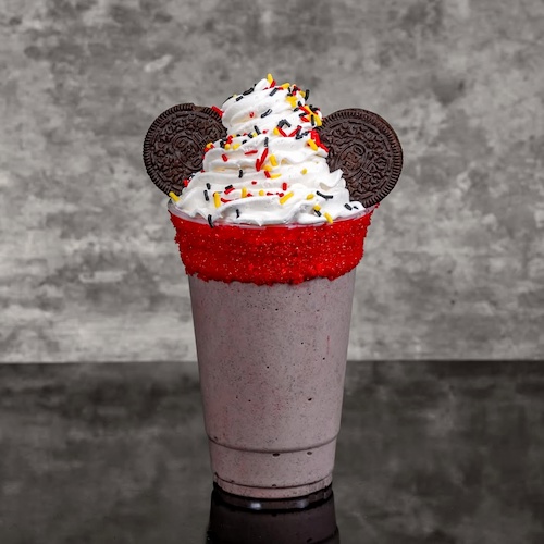 - Mint cookies and cream shake with whipped topping, sprinkles, crème-filled chocolate cookies, and red sugar rim
