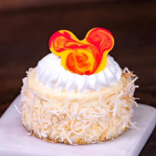- Coconut cheesecake rolled in toasted coconut with coconut whipped cream, white chocolate pearls, and a Mickey decoration