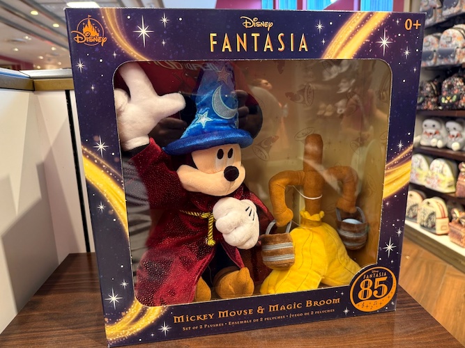The Fantasia 85th Anniversary Mickey Mouse & Magic Broom Plush Set is a delightful tribute to Disney's 1940 animated masterpiece, Fantasia. The plush set comes in a specially designed box featuring artwork from the film, making it perfect for display.
