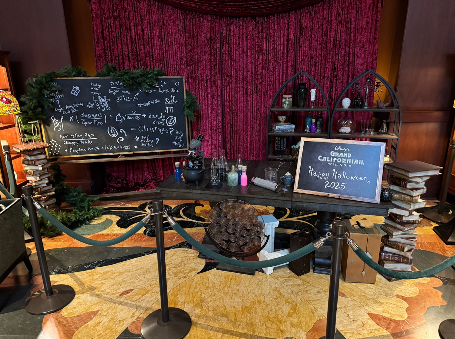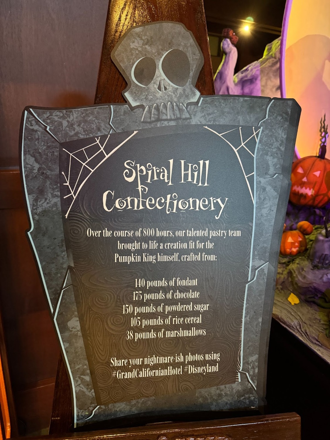 - Before the display arrived, the lobby offered a sneak peek of the theme of the edible display with a lab setup and chalkboard featuring hints like “Sandy Claws" and other holiday-themed words, teasing at The Nightmare Before Christmas theme.