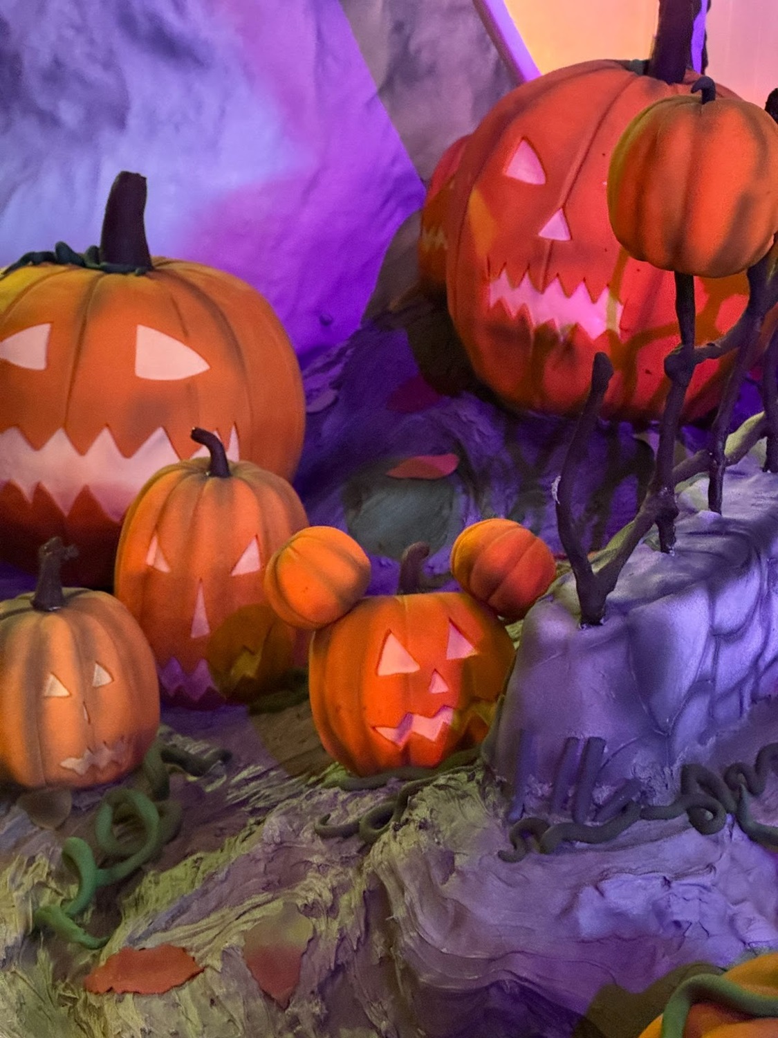 - Beneath them sits a patch of carved pumpkins—and, of course, we spotted a hidden Mickey!